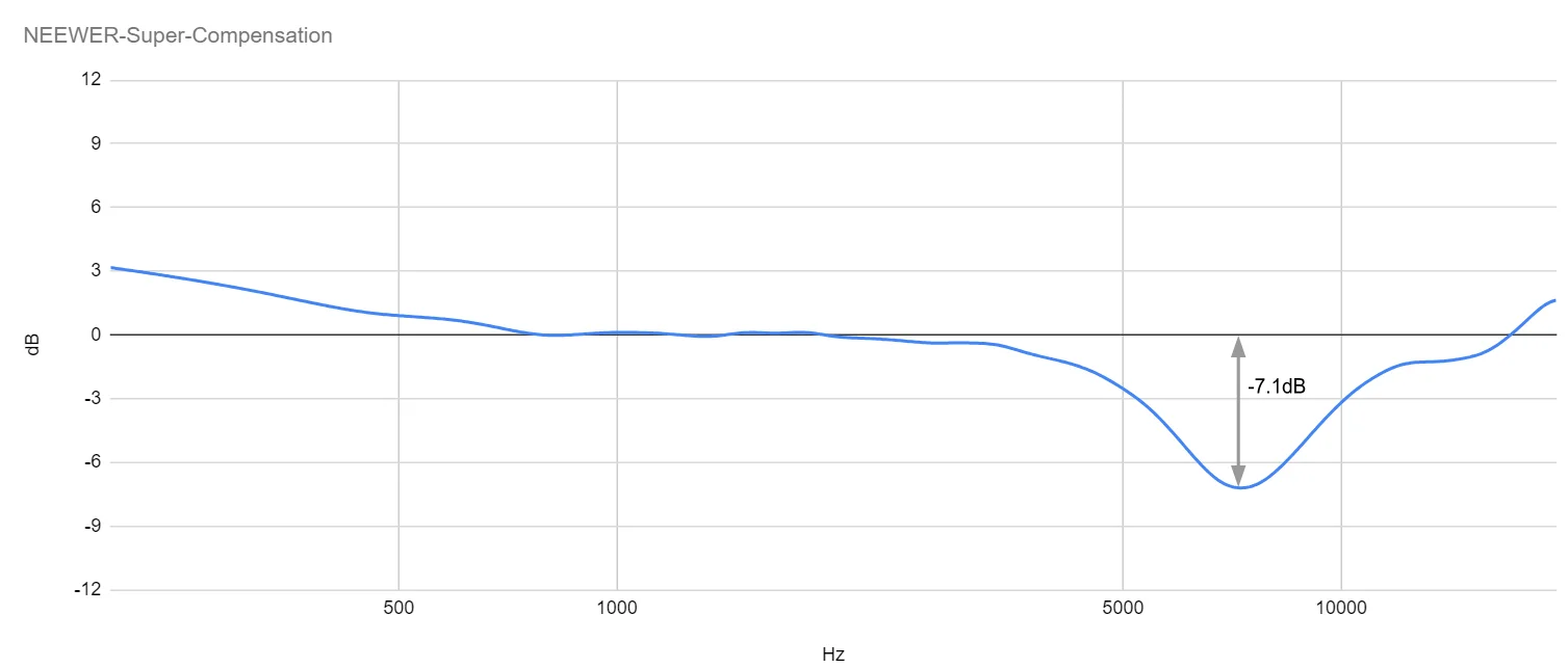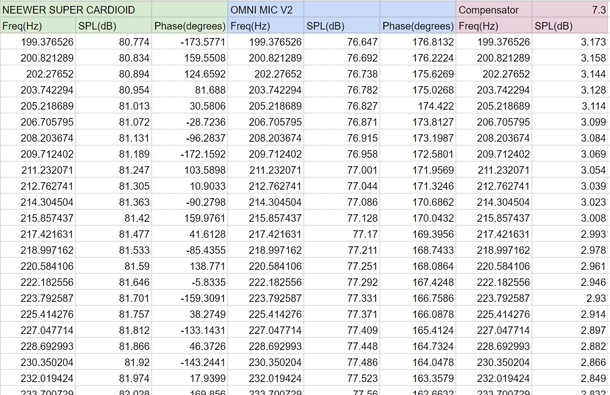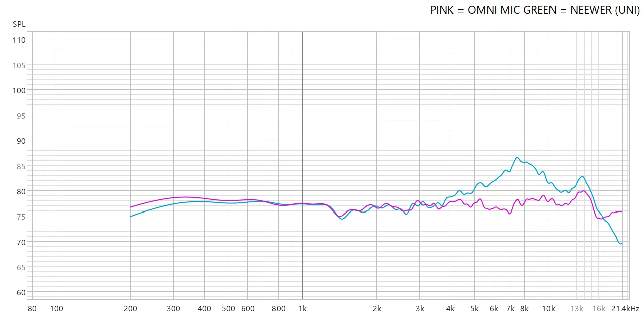OmniMicは計測用マイクロフォンだからただでさえ帯域内の特性はほぼほぼフラット。それに加えて、個体ごとの較正テーブルが付属しており、それによって特性補償されるから、完全どフラットです。その完全ドフラットと「差分」を採ると、それがNEEWERマイクの特性になるというわけです。