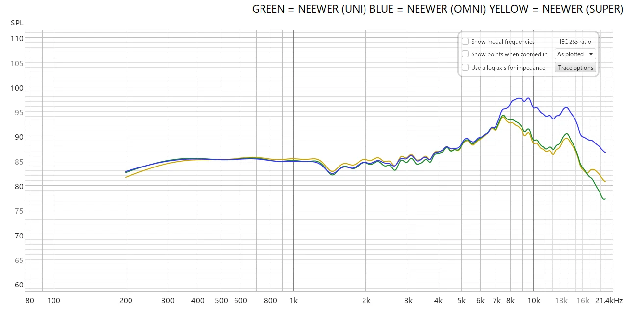 NEEWERは、中高域にコンデンサー膜の速度共振が目立って残ったf特になりました。