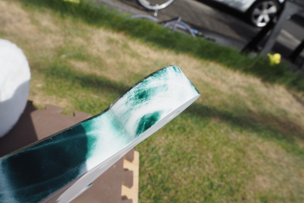 5分間ほどポリッシュしたでしょうか。あまりやると、クリアを貫通して下地の塗膜に貫通します。そうすると、塗装が混濁して濁り始めると思いますので寸止めします。
