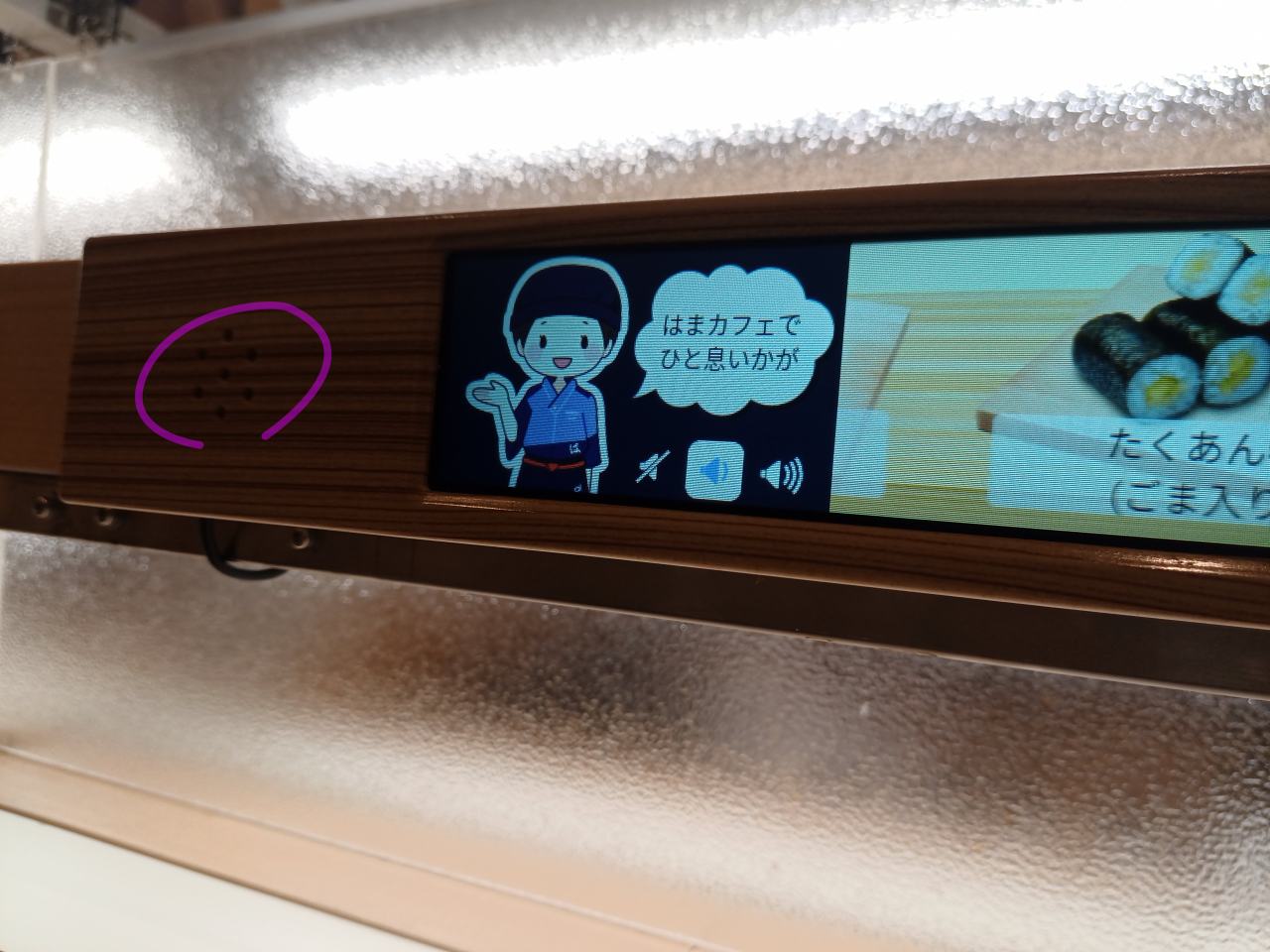 このタブレットから、オーダーするたびに花江さん、速水さんの声が聞けるわけですね。花江さんの声は聞き慣れてクリアですが、速水さんのどすの利いてやや渋低い声はくぐもって、イマイチよく聴こえません。タブレットに耳を押し付けてようやく聴ける。録音レベルを上げてくれ。。。