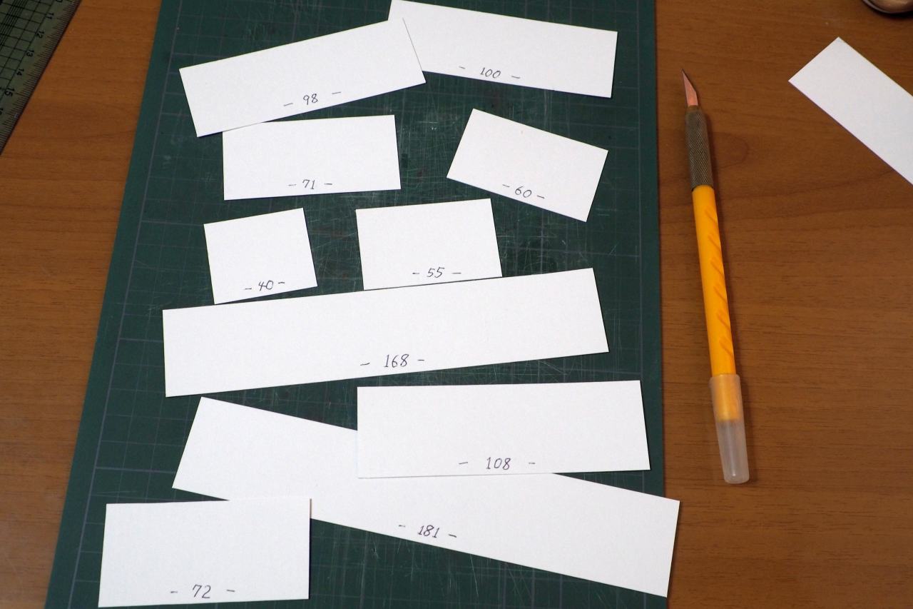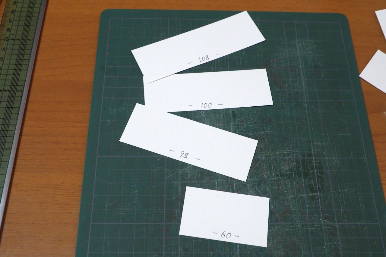 今回は、部材に合わせて紙のジグを準備しました。各々、とても正確に厚紙を切り出して寸法を記入しています。
