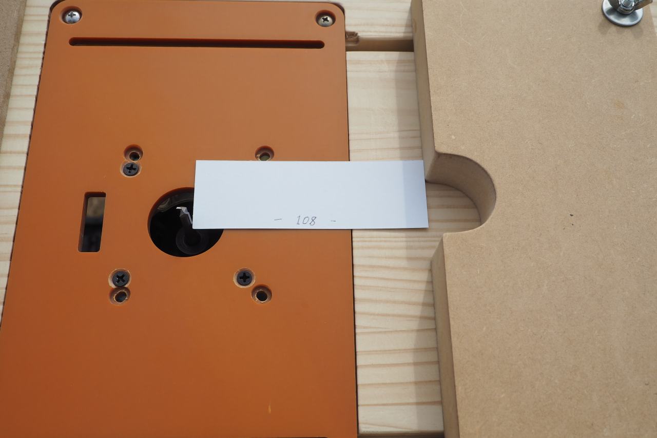 この厚紙ジグを使って、トリマーの間隔を調整するわけです… こんなふうに。