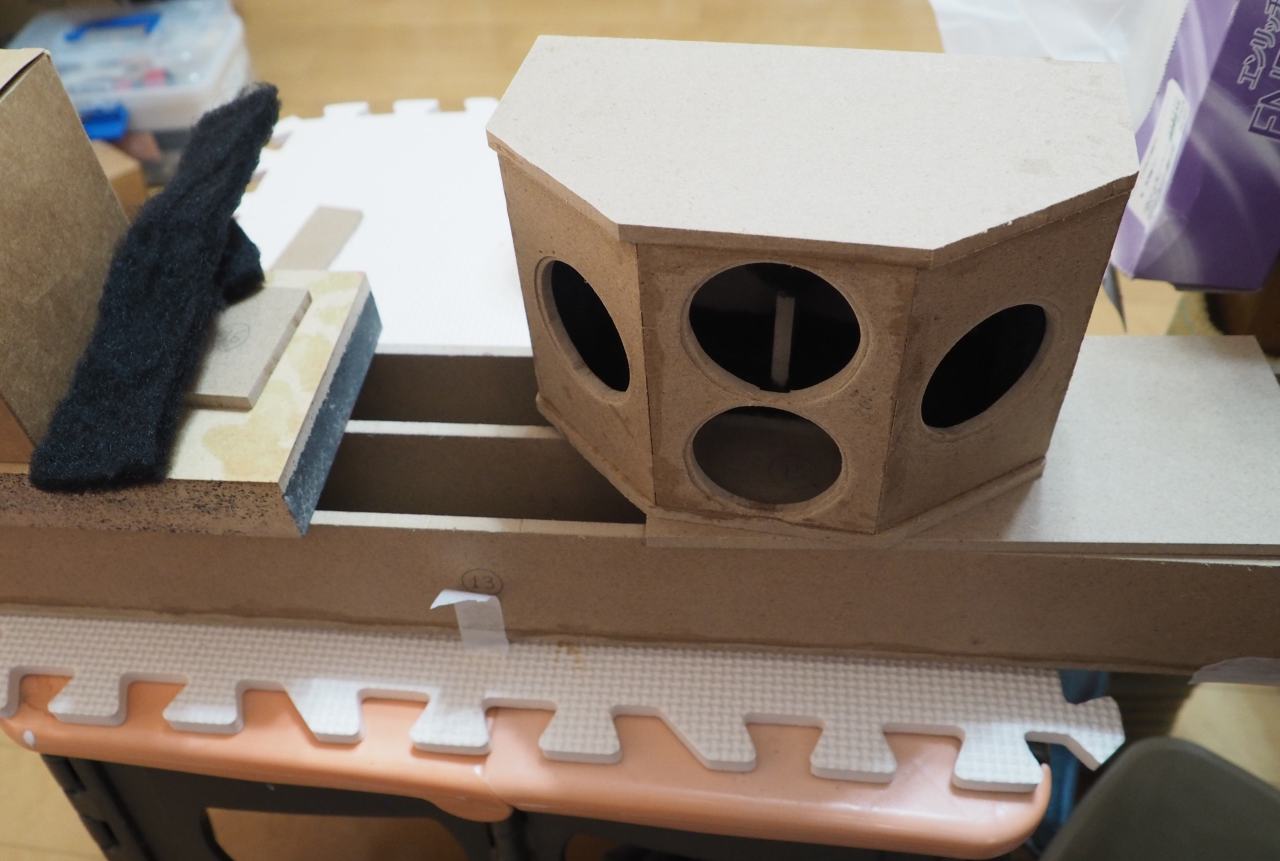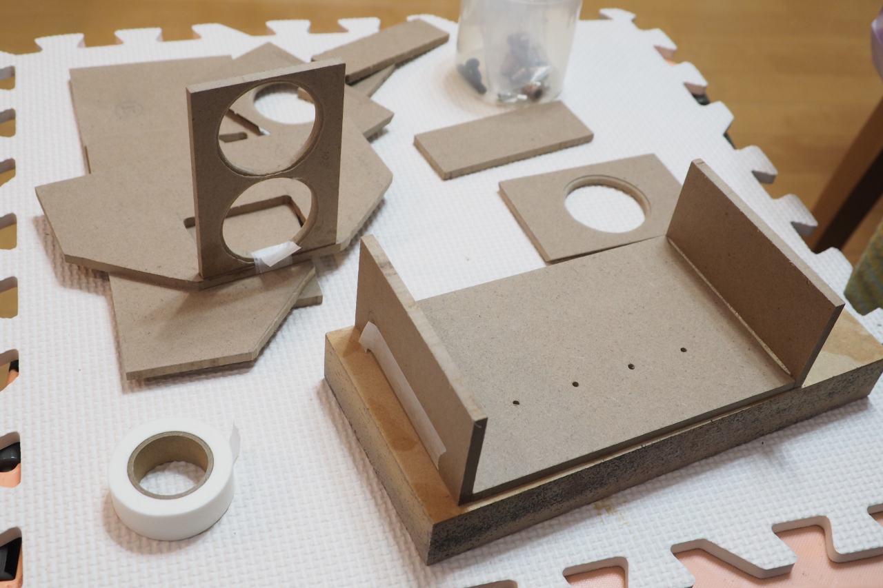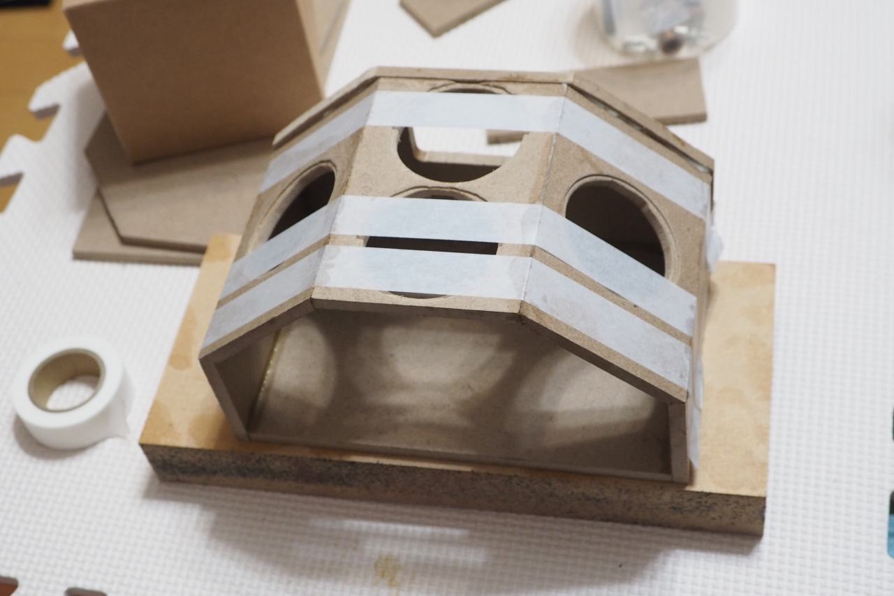 スラントバッフルの組付けは、マステで引っ張るだけ。(笑
