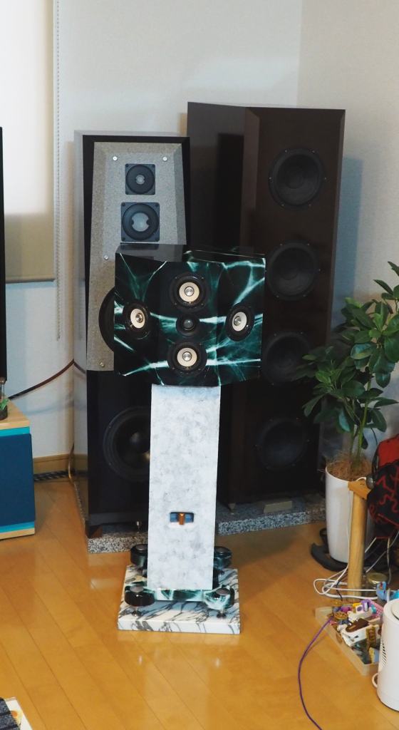 一番右側にあるのが、DIATONEのDS-2000Zという大型のブックシェルフです。純正スタンド上に乗せてみました。皆様には実物をご覧になった方も多いかと思います。
