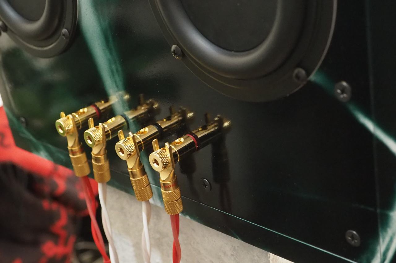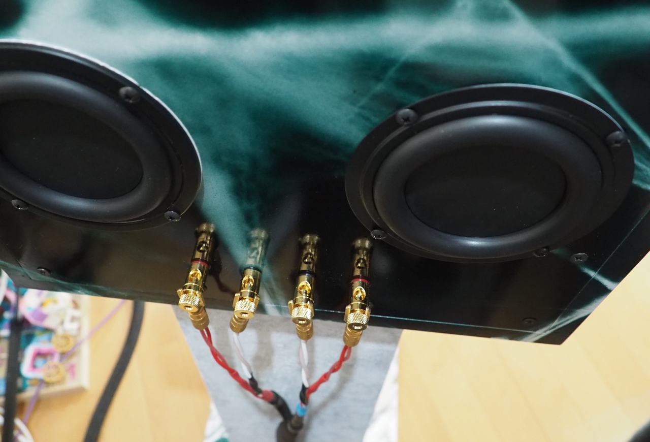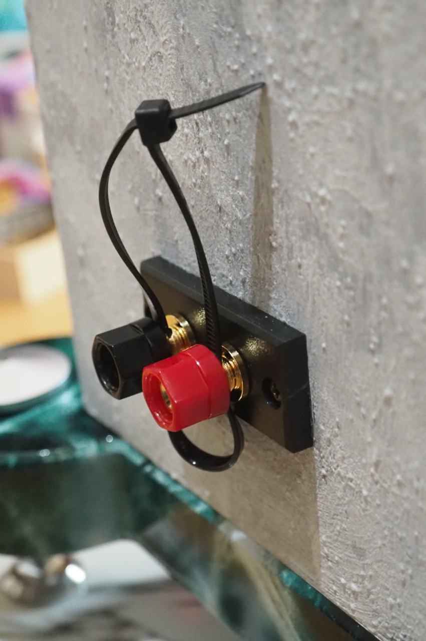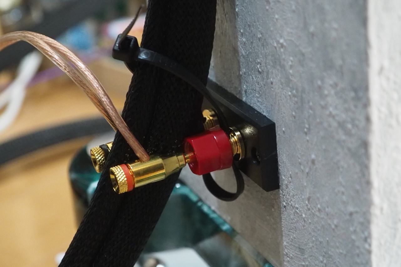 ちょっと分かりづらいですが、サブウーファーターミナルにタイラップを通しました。このリングの中にケーブルを通すことで、ケーブルを万が一引っ掛けても直接荷重がヘッドに掛かりづらくなります。質量の一部をこのタイラップが支えるから荷重の分散にもなります。