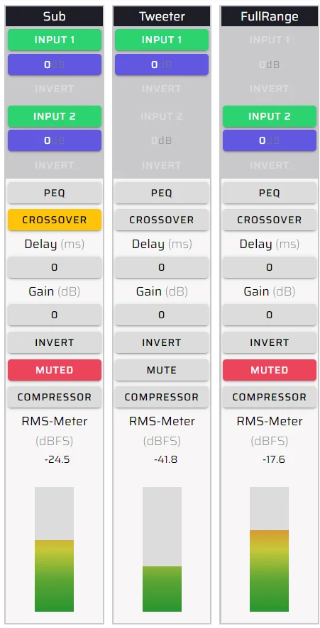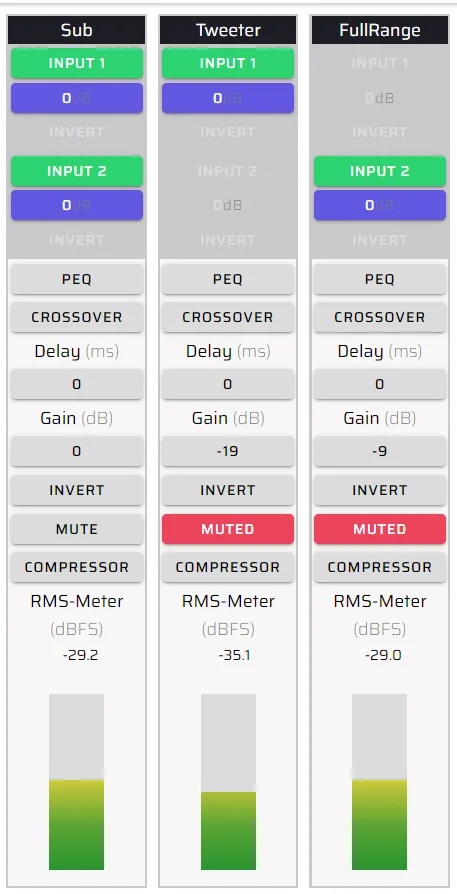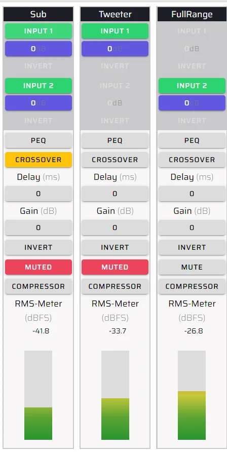 テキトーなXoverを準備して、テキトーなジオメトリでモノラル音で音楽を鳴らしました。センターのフルレンジ1本だけが鳴っており、ほかの3本はMUTEです。