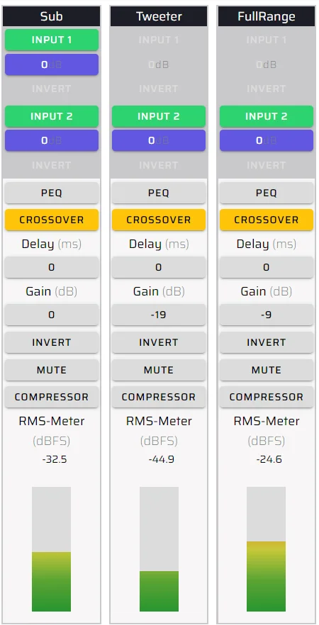 一般的なシステムで、モノラル信号を生成するのはタイヘンですが、miniDSPならばINPUT1とINPUT2を双方ONにすることで、勝手にモノラル信号がch6から出力されます。(つまりアナログによるミキシング回路は不要ということです)