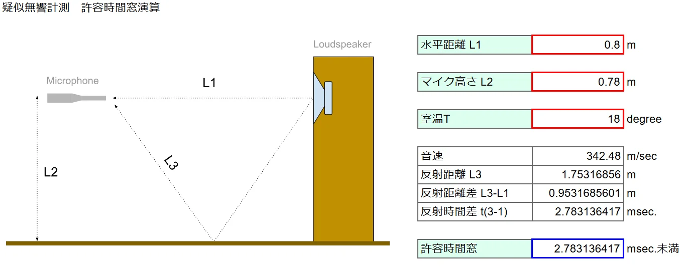 今回はトゥイーター高さ軸上を基準値としてファーフィールド計測を行いますので、高さは床上78cmです。いつもの許容時間窓スプシで計算してみると、許容できるタイムウィンドウは2.8ms未満です。さすがにそれでは中低域まで解析できませんので、5msまでは拡張します。