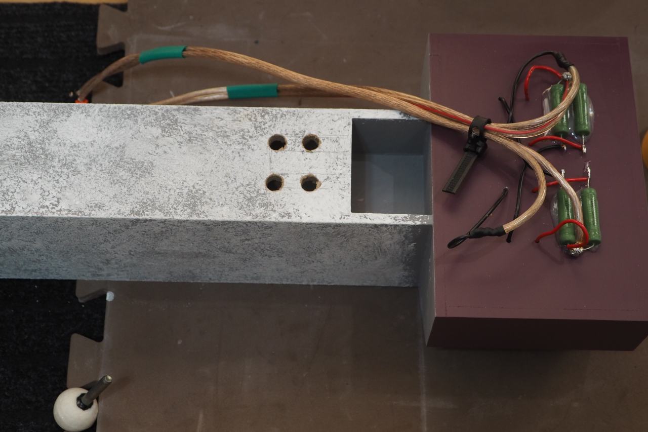 実装形態は、色々と悩みましたが、パイプ部分に穴を開けてしまいました。ここからケーブルを通します。