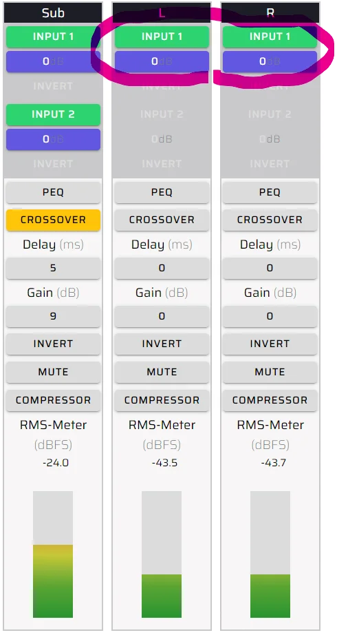 これでLchへいつものテストシーケンス信号を流すと、センターのスピーカーがモノーラルのMTMとして動作するのです。すなわち、上記の課題がすべて解消されます。低域は設計値どおりに動くし、上下ドライバとトゥイーター間(=MTM間)で位相干渉も起こって実動作に近くなります。