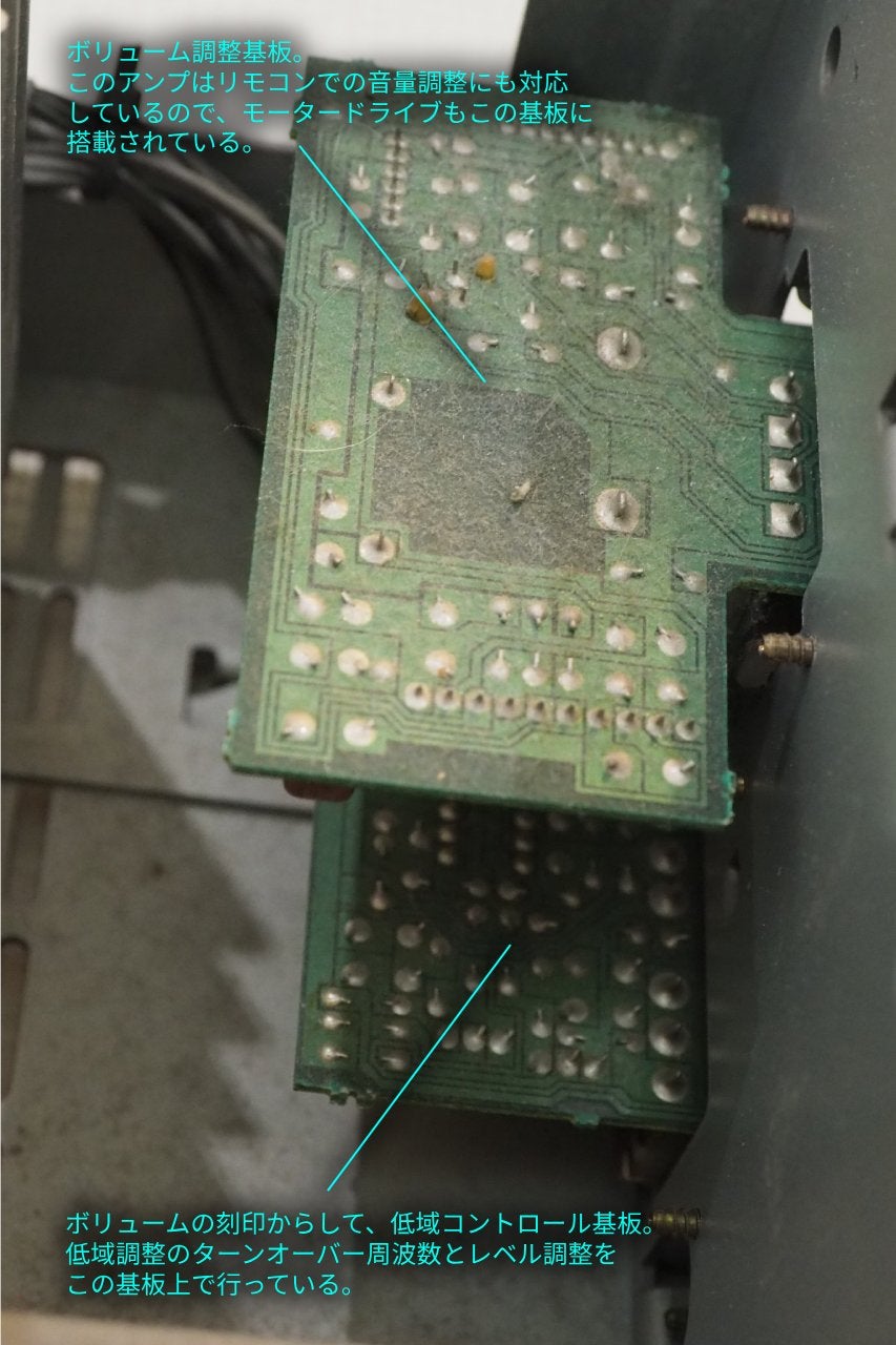 このため、ロータリーエンコーダーを介して、入力信号が背面パネルからあまり離れずに制御され、信号がフロントパネルとリアパネルの間を往来しないように工夫されています。しかし流石に、ボリュームと低域調整の基板はフロントへ持ってこざるを得ず、そこだけはラインケーブルで前面パネルへ引き回されていました。