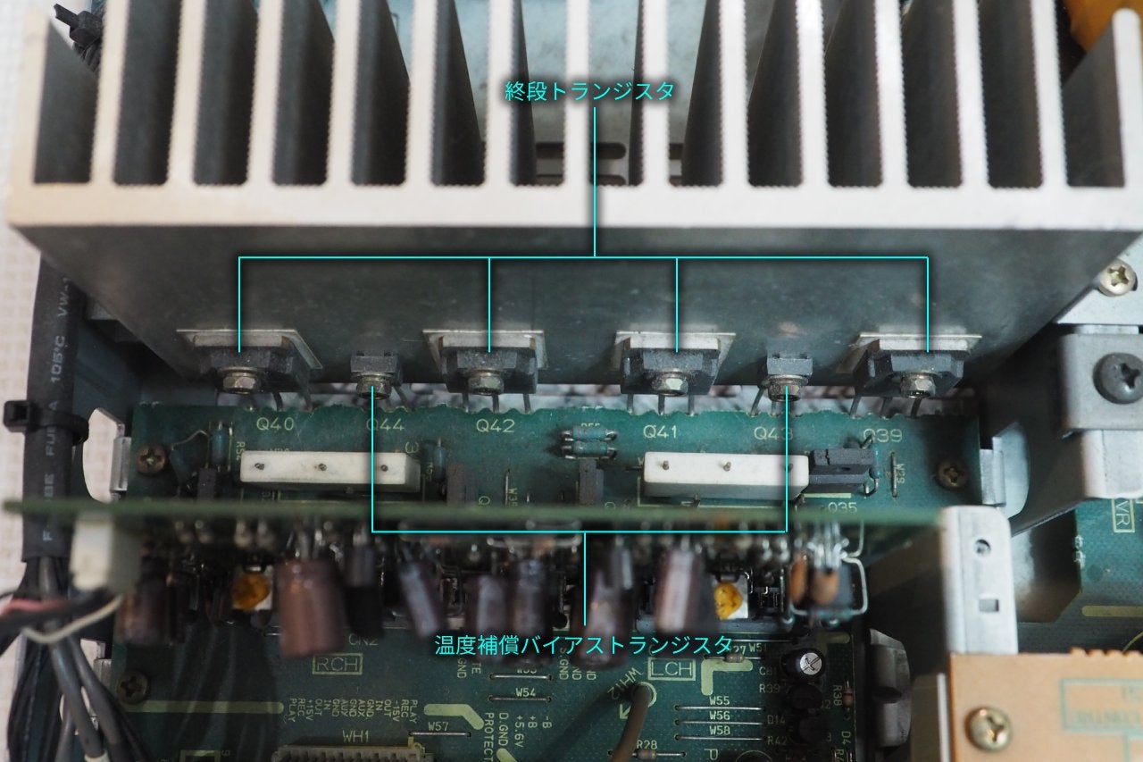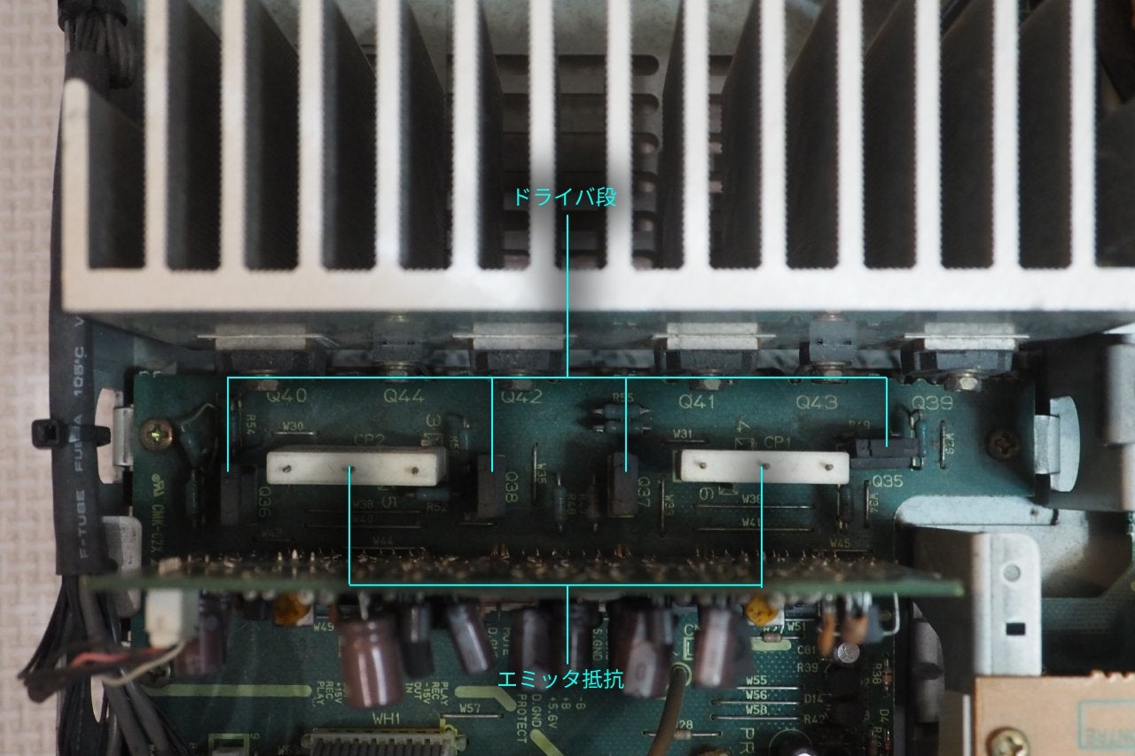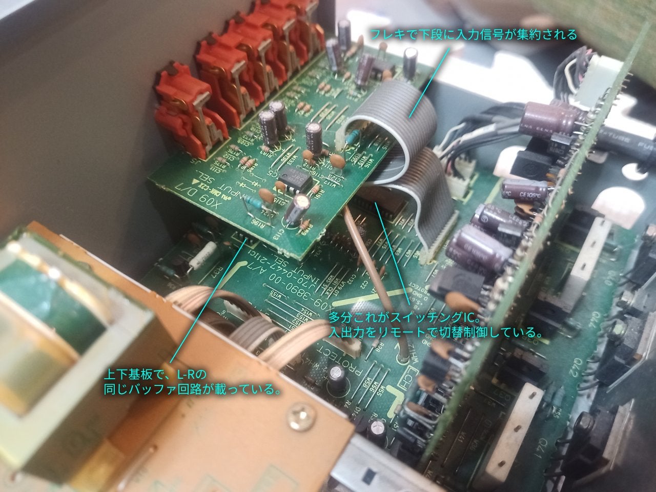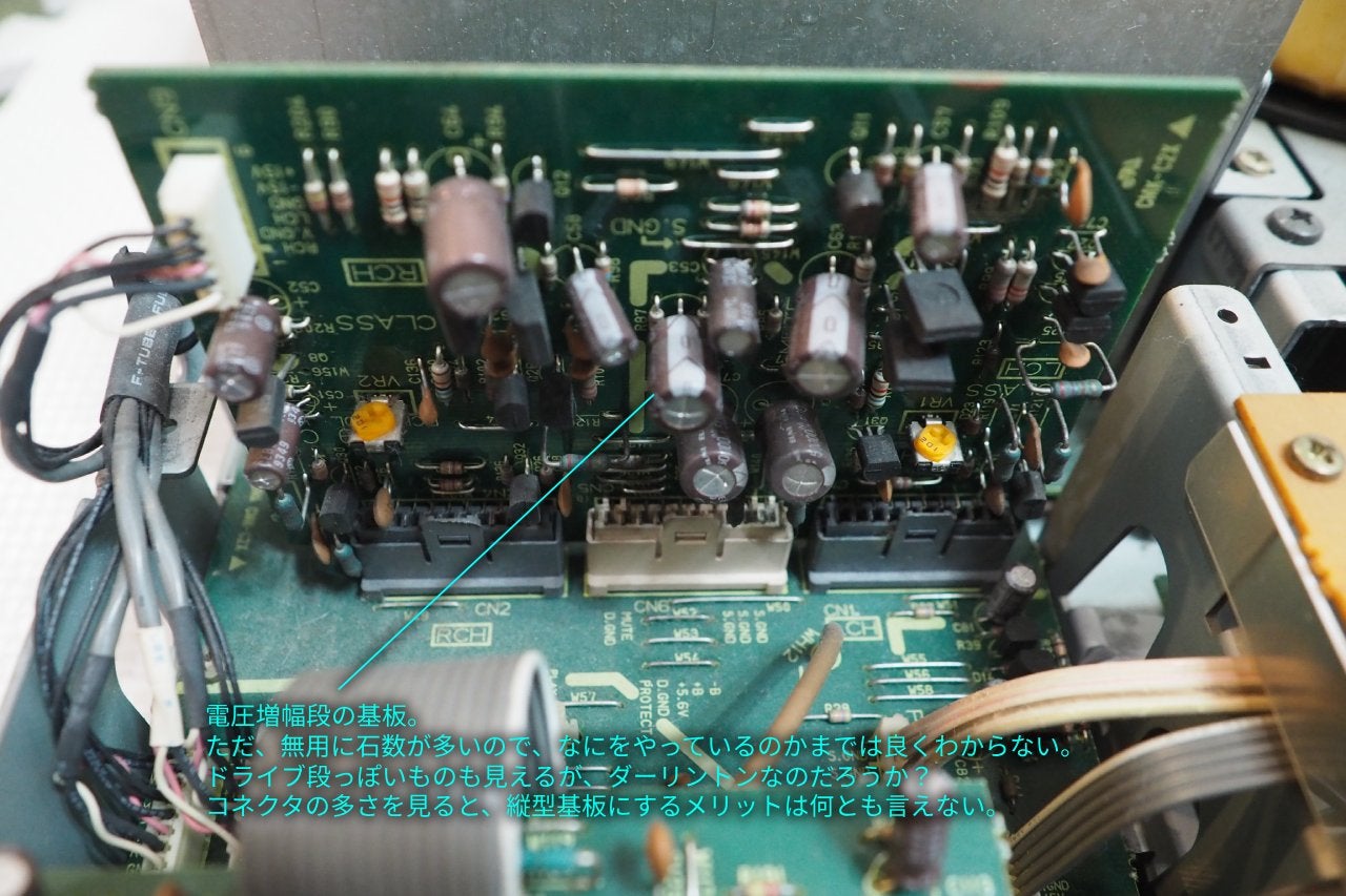 大雑把な仕分けを行いましたが、パターンを読み切れば、各基板上の各パーツもさらに分解して役割を読解は可能になります。プリアンプやパワーアンプの代表的回路をそらんじていれば、読解はさらに容易になるでしょう。差動、ダイヤ差動、カスケード、ブートストラップ、バイアス回路、温度補償、ダーリントン、DCサーボ・・・。