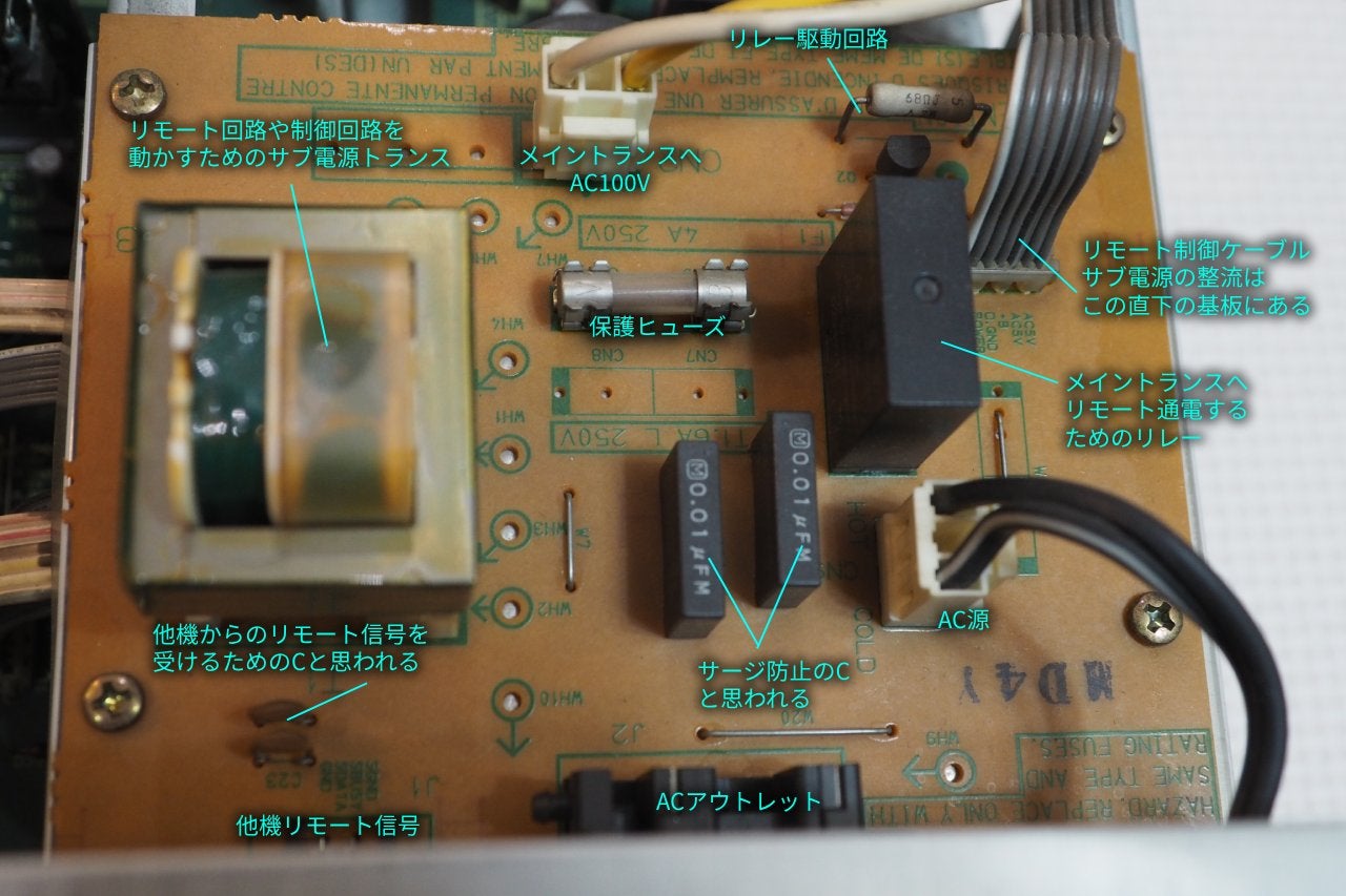 脇の小さな電源トランスで、リモコン回路のみを常点し、赤外線リモコン信号を受光すると、リレーを介してメイン電源トランスへ通電する仕掛けと読みました。