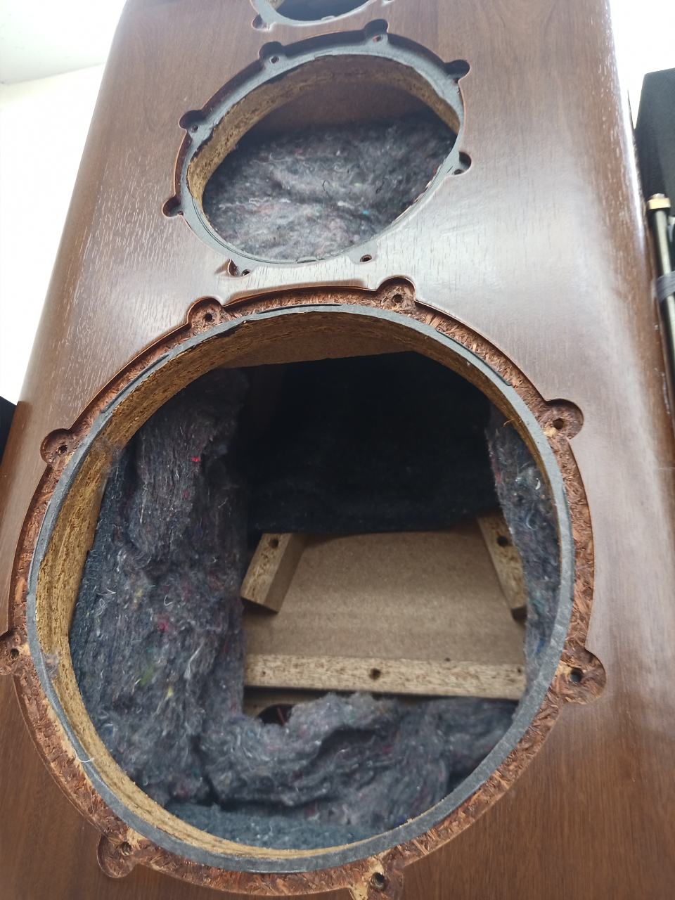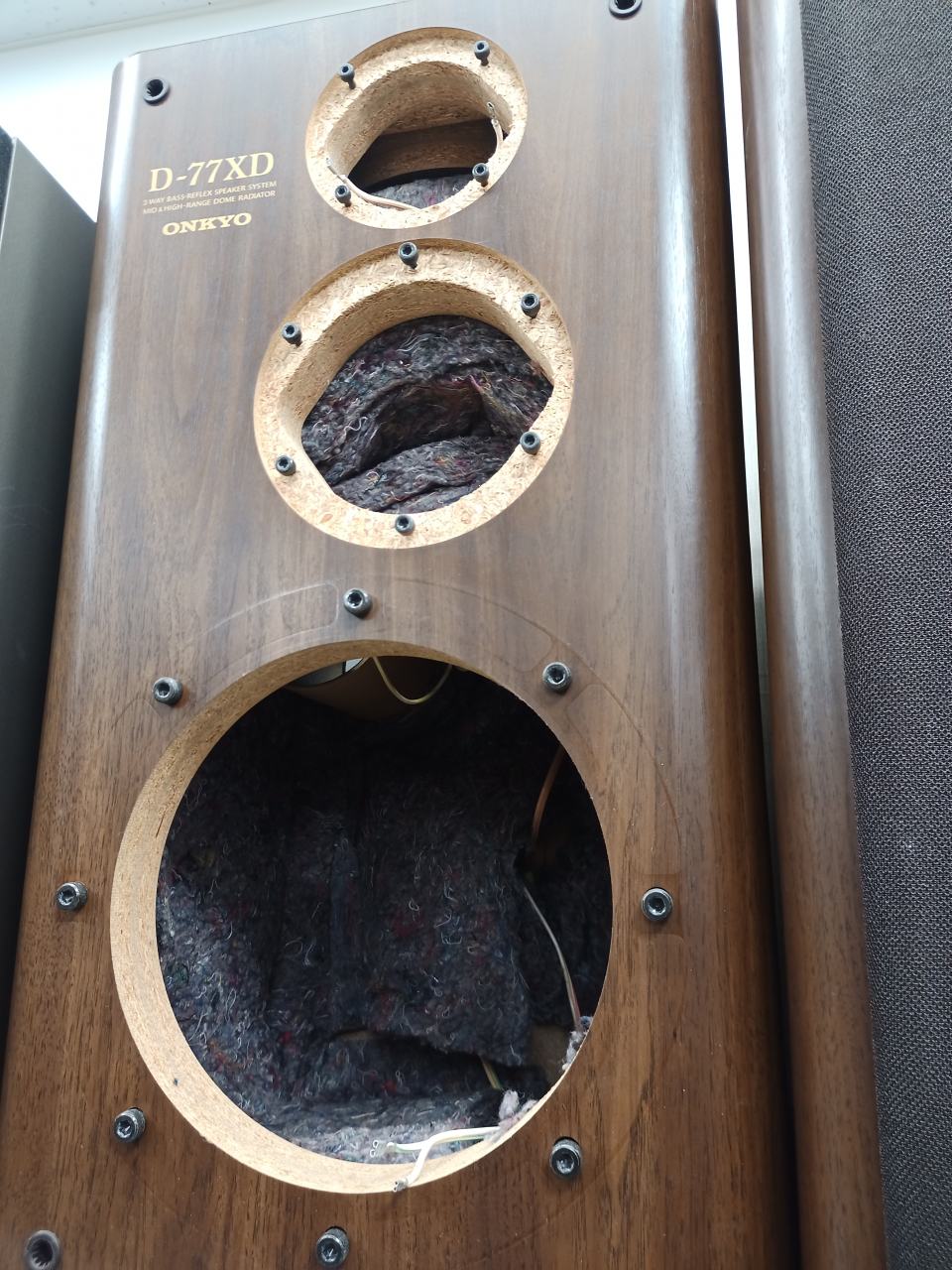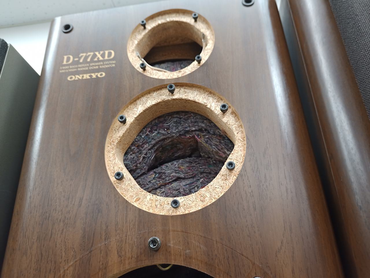 なかでも日本の激しい温度湿度変化に晒されているパーチのエンクロージャーは痛みが激しくなります。吸湿を繰り返すことにより、パーティクルボードは膨張や崩落が始まって初期性能を維持できなくなります。MDFもそこは同様なのですが、表層に適切な表面処理を施すことによって、耐用年数はずっと長くなります。