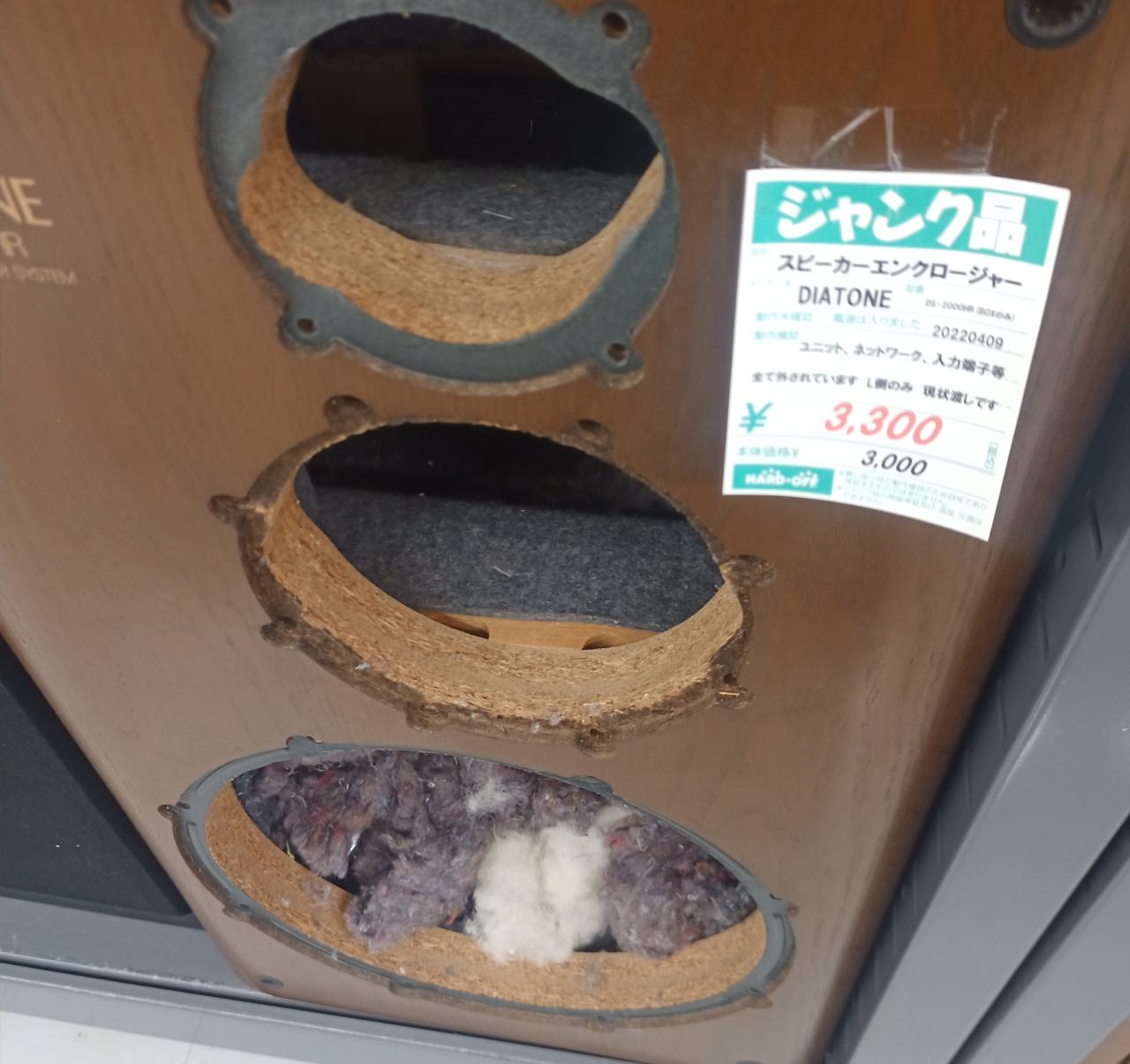 なかでも左から2番めのこれ。完動ではないが動作品で、3850円。かなりグラっと来ましたね~。でも、どうせ持ち帰っても修理のモチベは低いし使わなくなるだろうから、思いとどまりました。偉い、ジブン。これを「購入前ダンシャリ」と呼びます!
