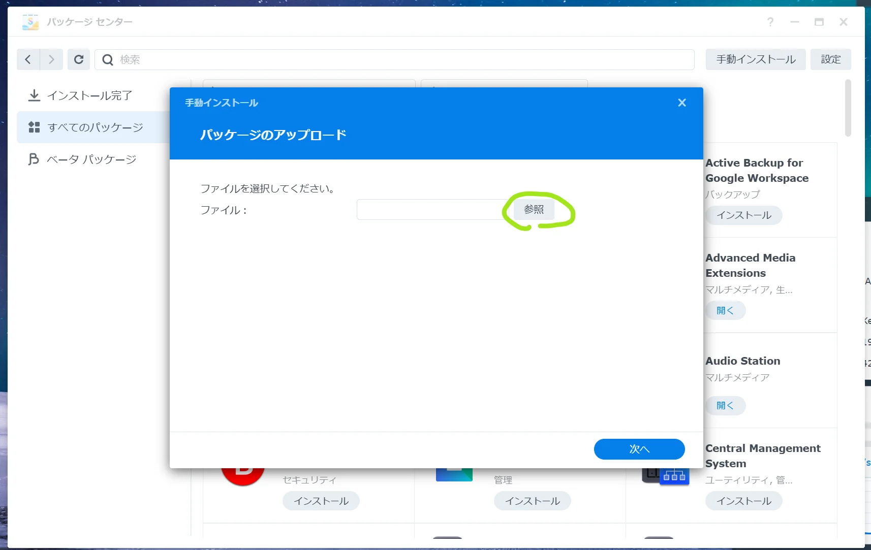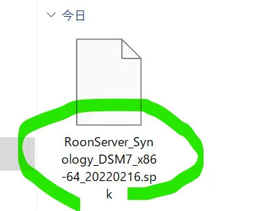 あらかじめ、Synology用のRoonサーバーアプレットを見つけて、ローカルへダウンロードしておきます。
