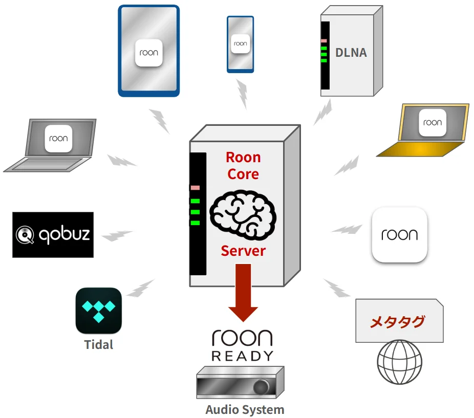 やっぱり、この中で言うと「Roon Core」と描いてある所ね。これがキーになります。周りに色々なものが取り巻いていますね。PC、タブレット、スマホなどの再生を指示する機器はもちろんのこと、Roonそのもの、Qobuz、Tidalといったストリーミングサービス、音楽サービス。これら全てを取りまとめたブレイン(頭脳)になる。