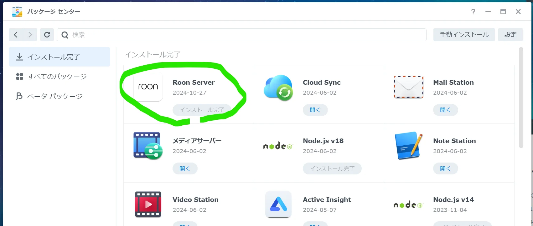 インストールが成功するとパッケージ一覧に「Roon Server」が。