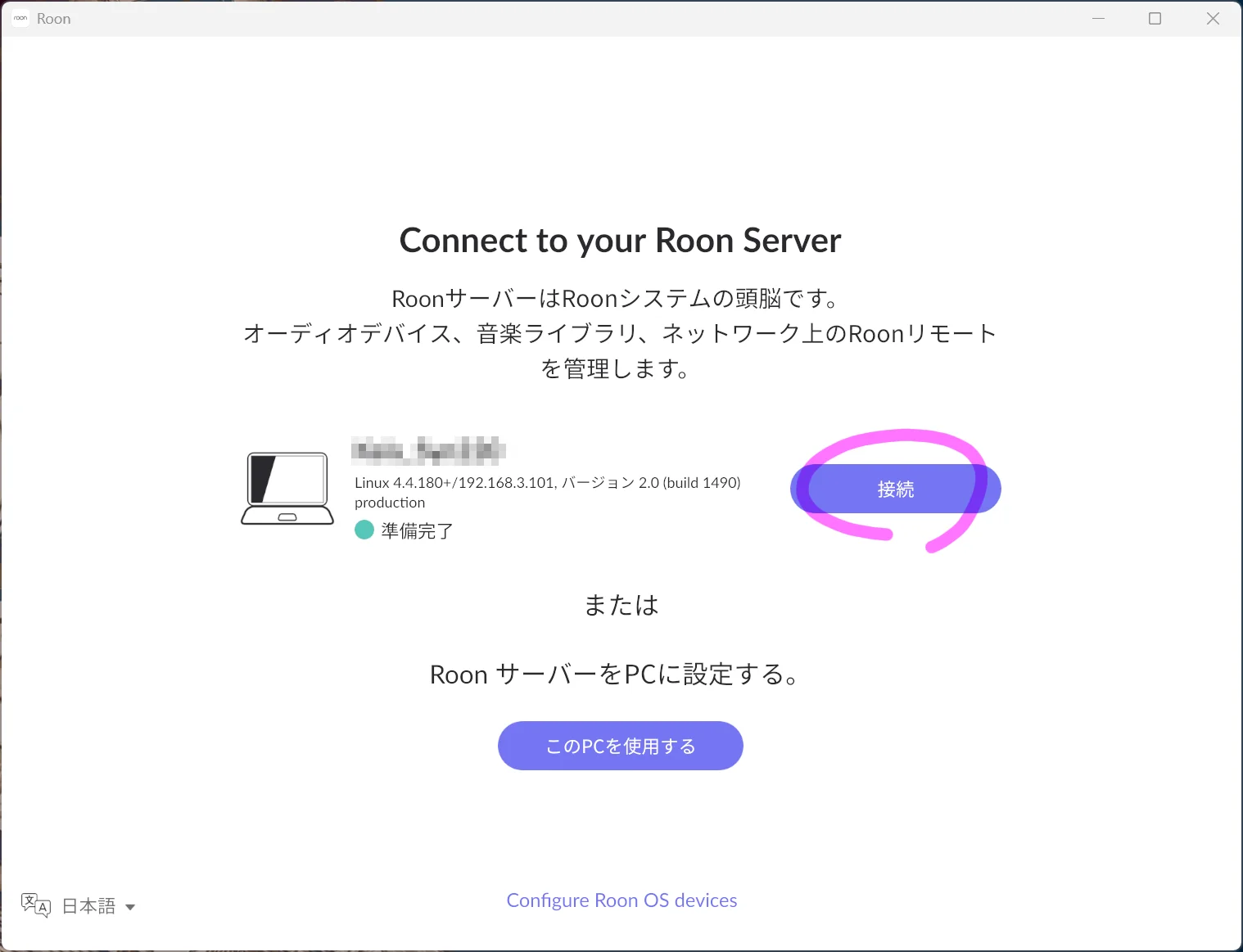 今使っているPCを母艦にもできます。その場合は、「このPCを使用する」を選択すれば、Roon Serverとしてのセットアップが始まるわけです。
