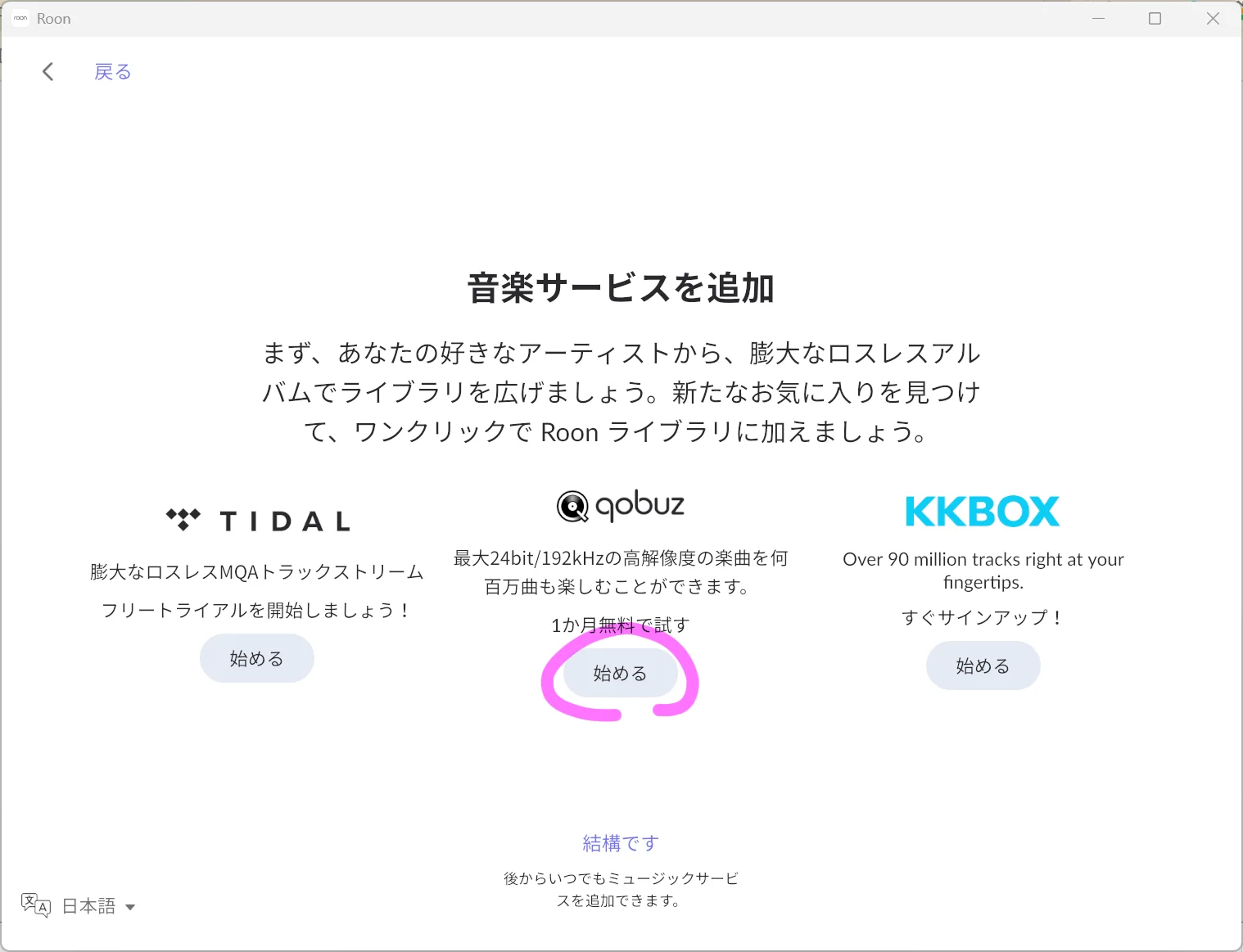 つづいて、Roonと接続させる外部ストリーミングサービスを指定します。
