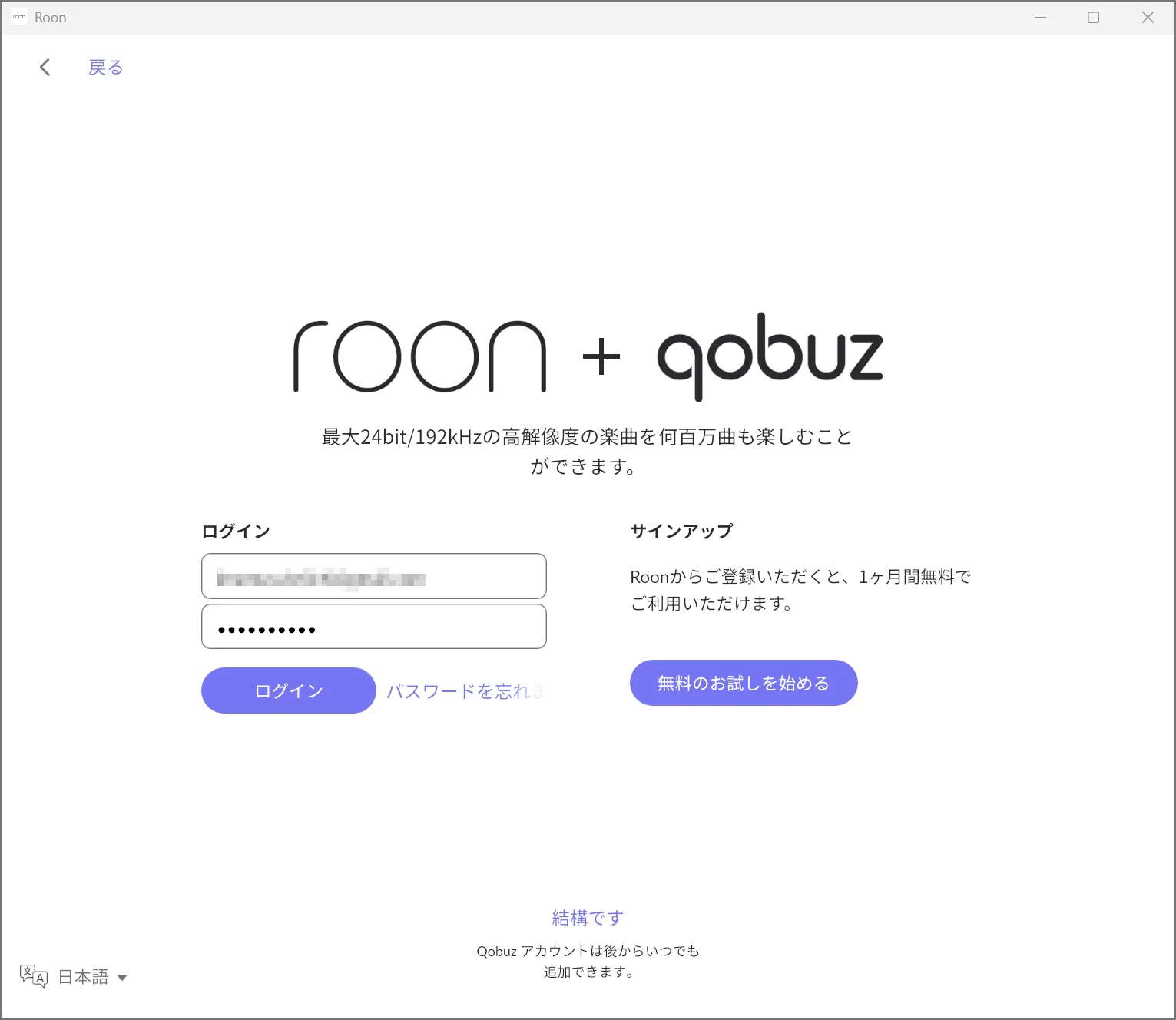 Roonのログインのように見えますが、これはqobuzに対するログインです。アカウントのIDやパスワードを混同しないように注意してください。