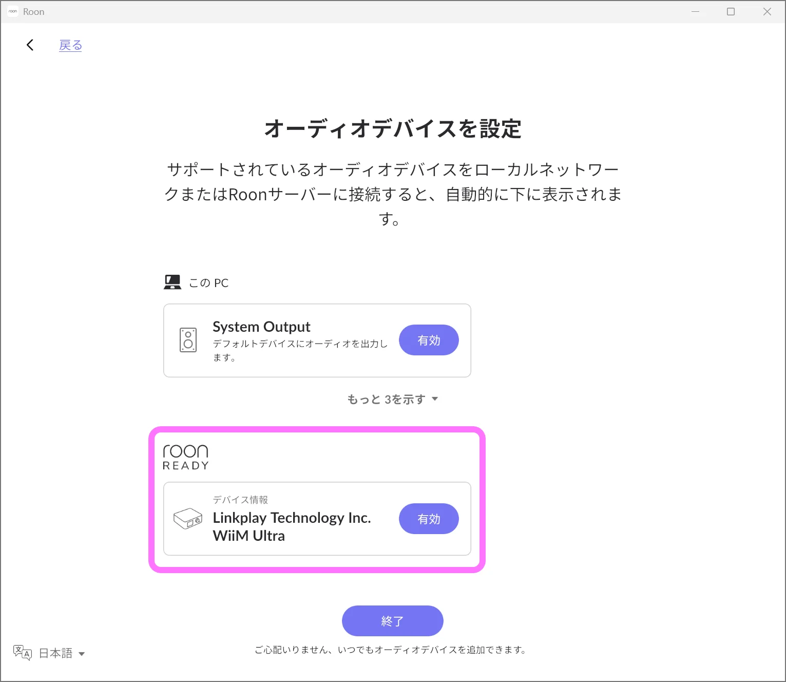 次に、Roonではオーディオデバイスを選定する画面になりました。
