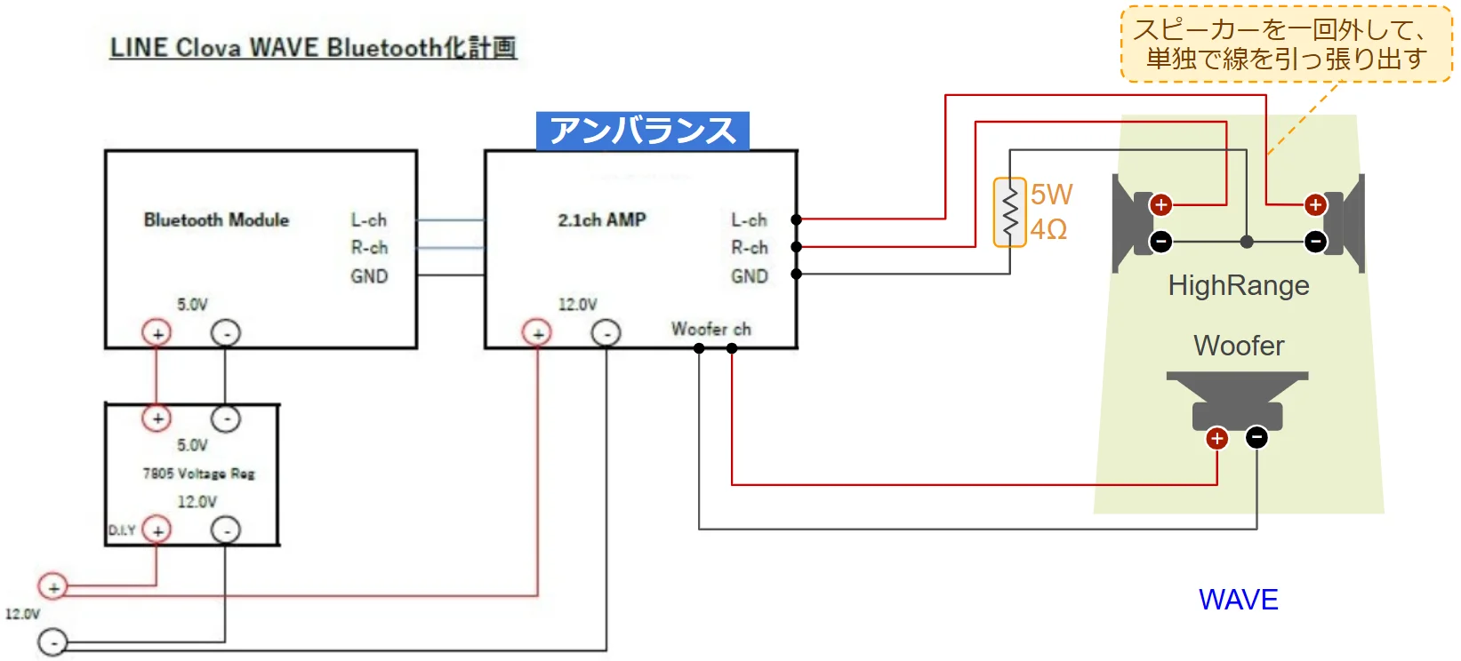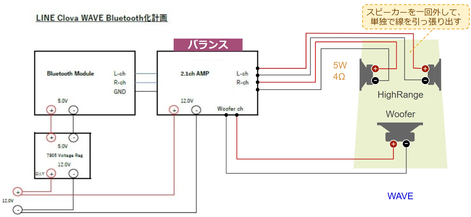 このClova WAVEにもともと搭載されているアンプボードは使えません。 この基板を除去して新しいステレオアンプ、願わくば2.1chアンプに載せ替える必要があります。勝手ながら ブロガーBay3さんの描いた回路図を一部引用させていただき、結線を説明したいと思います。