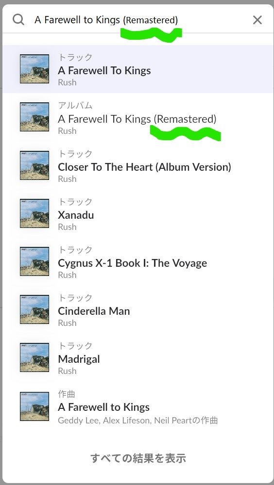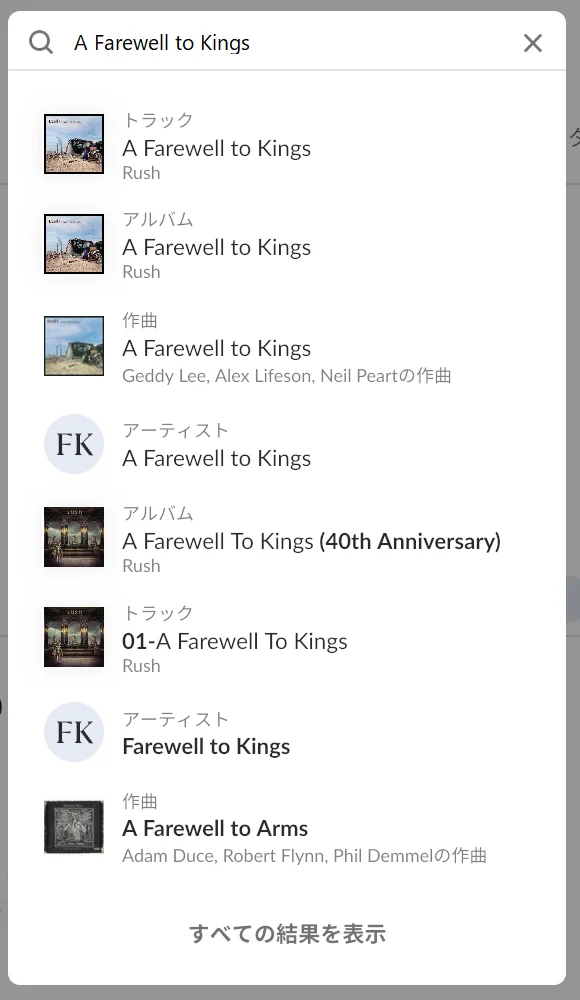 普通は上方検索だから、[A Farewell to Kings]と打った所で候補に表示されてしかるべきです。さらに「すべての結果を表示」を押しても、Qobuzのライブラリは全く表示されないのです。