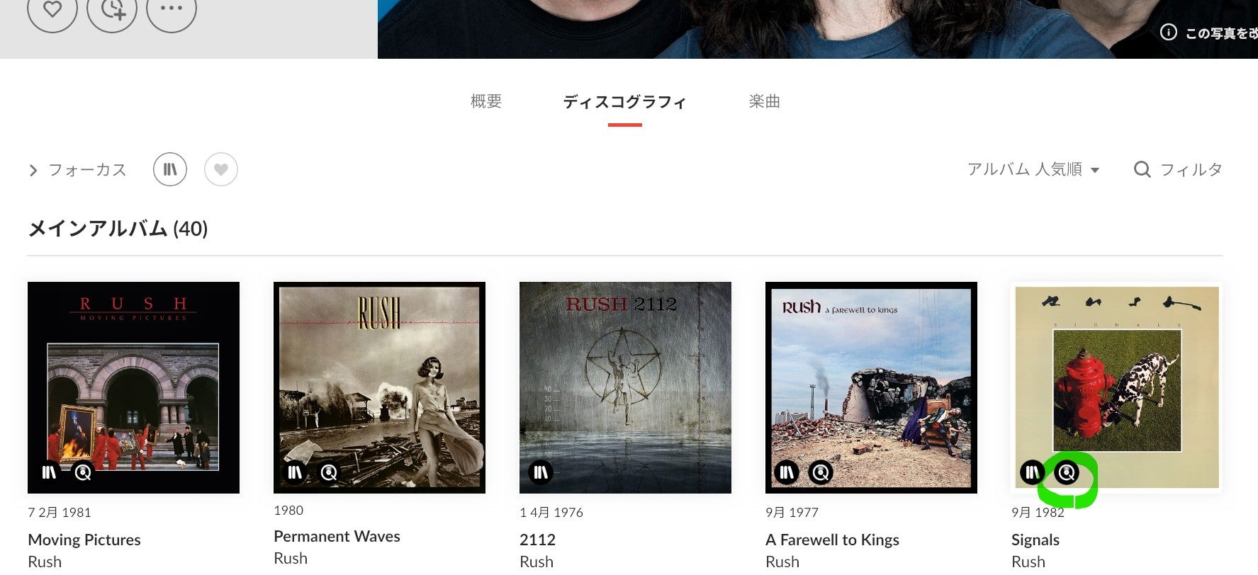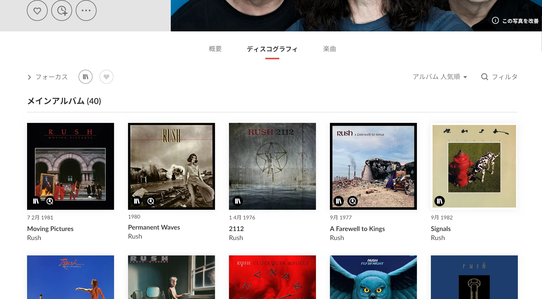 [Rush]というアーティストから、「ディスコグラフィ」を表示してみます。