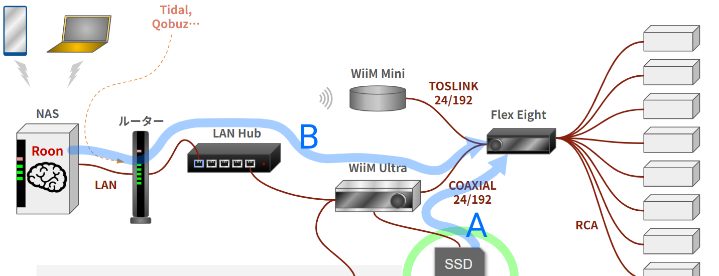 WiiM Ultra にUSB-SSDをぶら下げてみたのが、前回。 今回はその比較試聴を行っていきます。表題は SSD vs イーサネットとなっていますが、もう少し詳しく書くと座組がかなり違います。 (A) USB_SS … 続きを読む ネットワーク改良 (4)WiiM Ultra 対決! SSD vs イーサネット