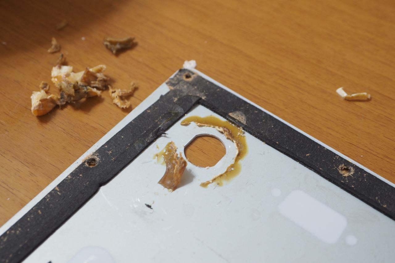 破壊しながら強引に引き抜きました。パネルに癒着した接着剤も根気よく除去しました。