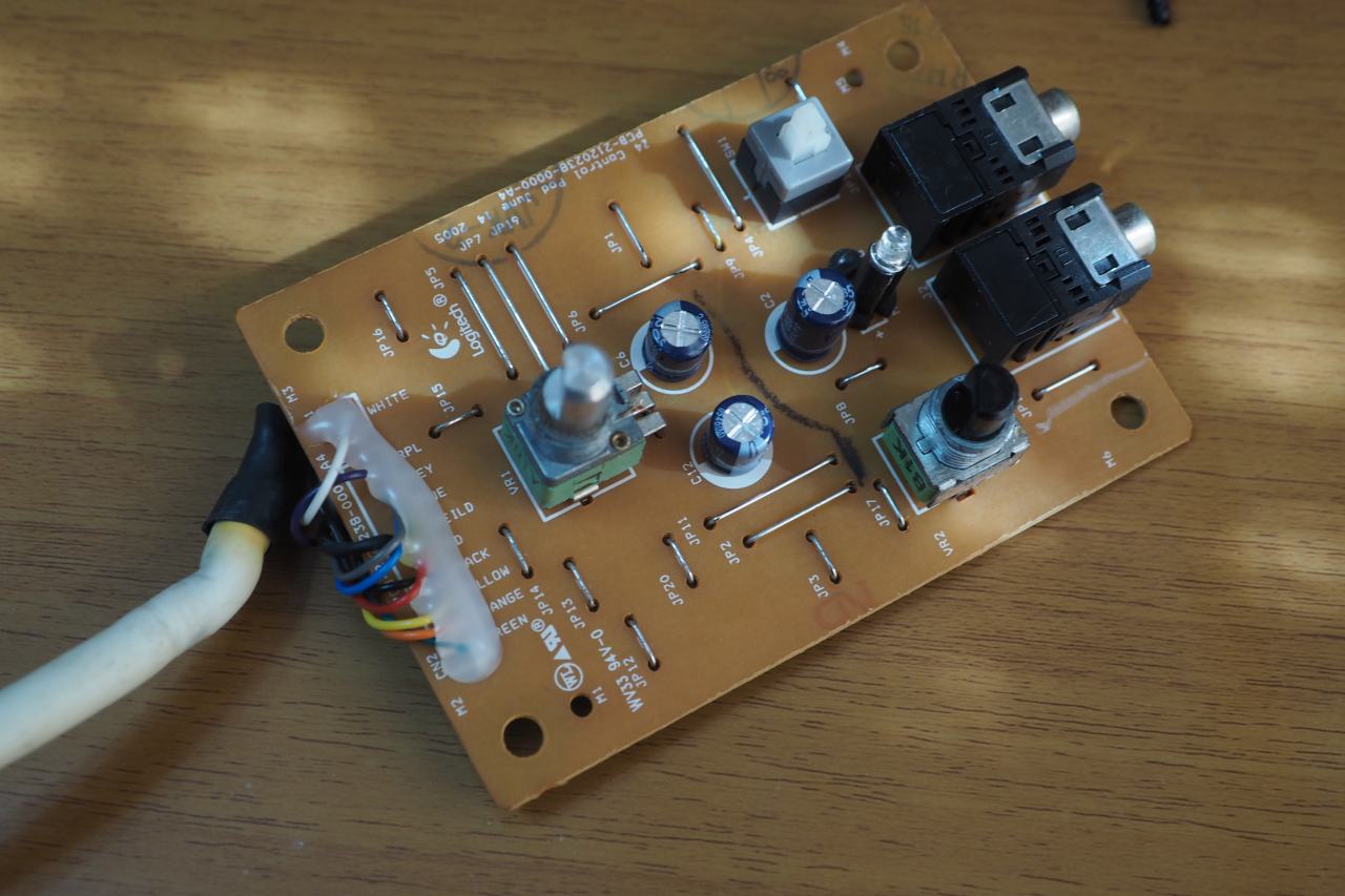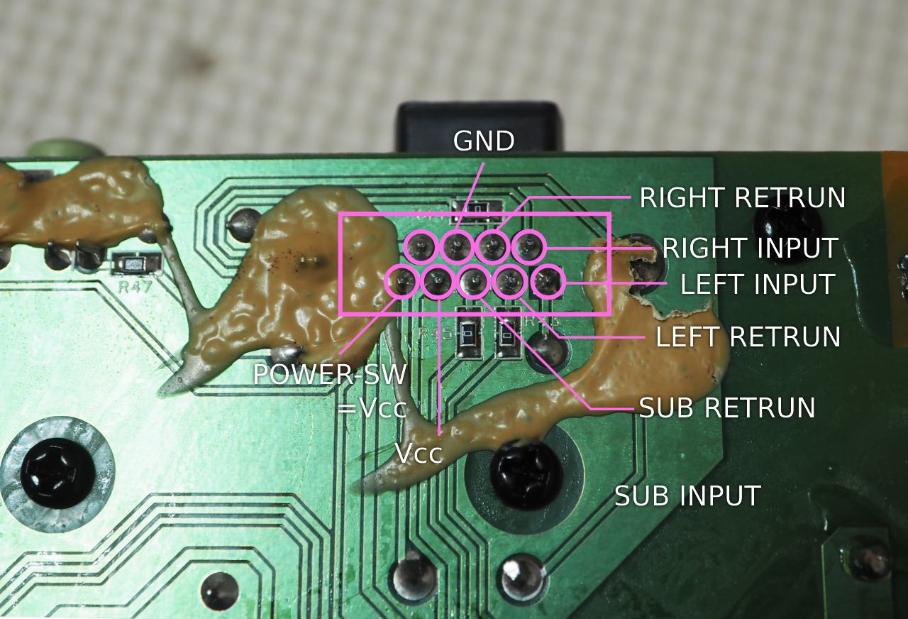 外付のOPアンプで別途ミキシングLPFを組むことも考えましたが、せっかく動作している回路があるのだから、この基板をサブウーファー本体側に移植するのが最も手っ取り早そうです。配線数が多い(10PIN)ので難儀しますけどね。できなくはない。