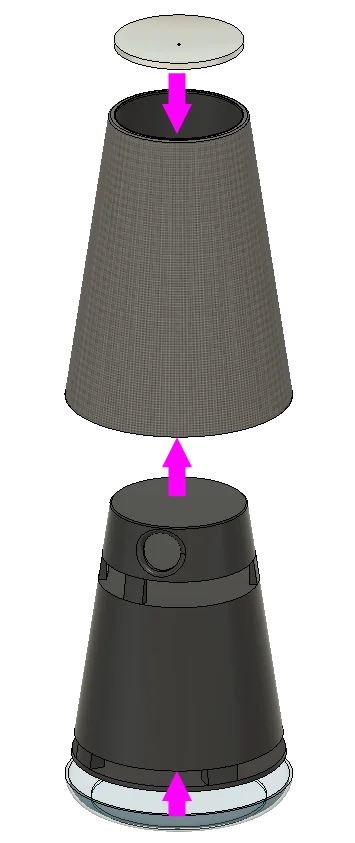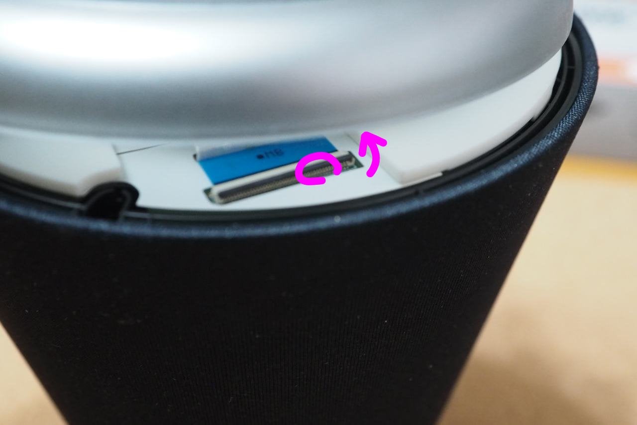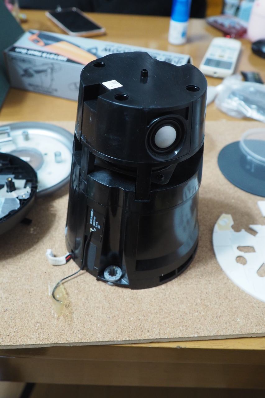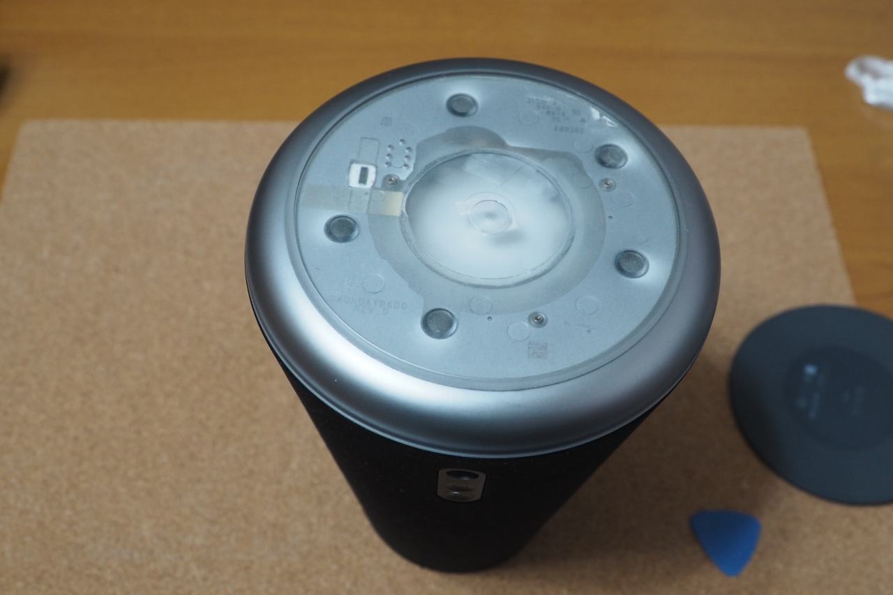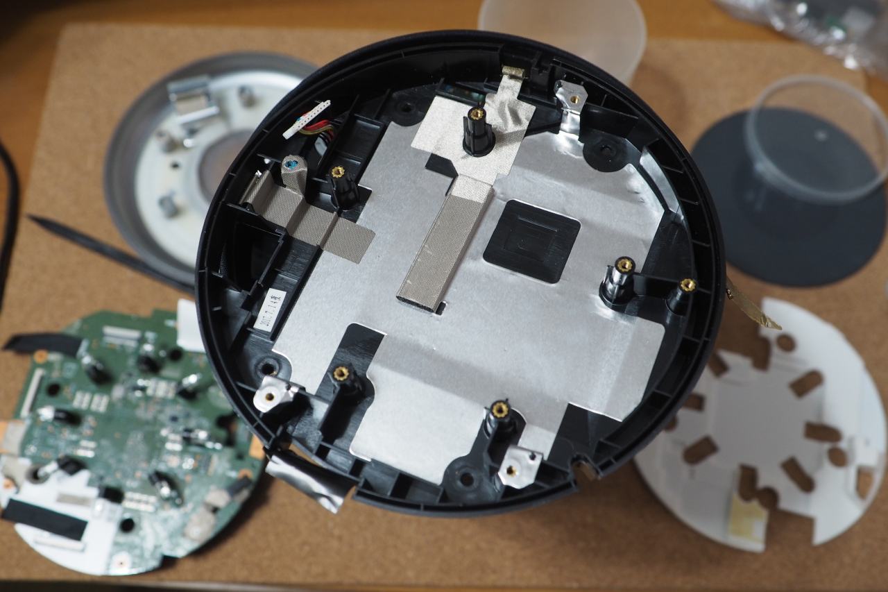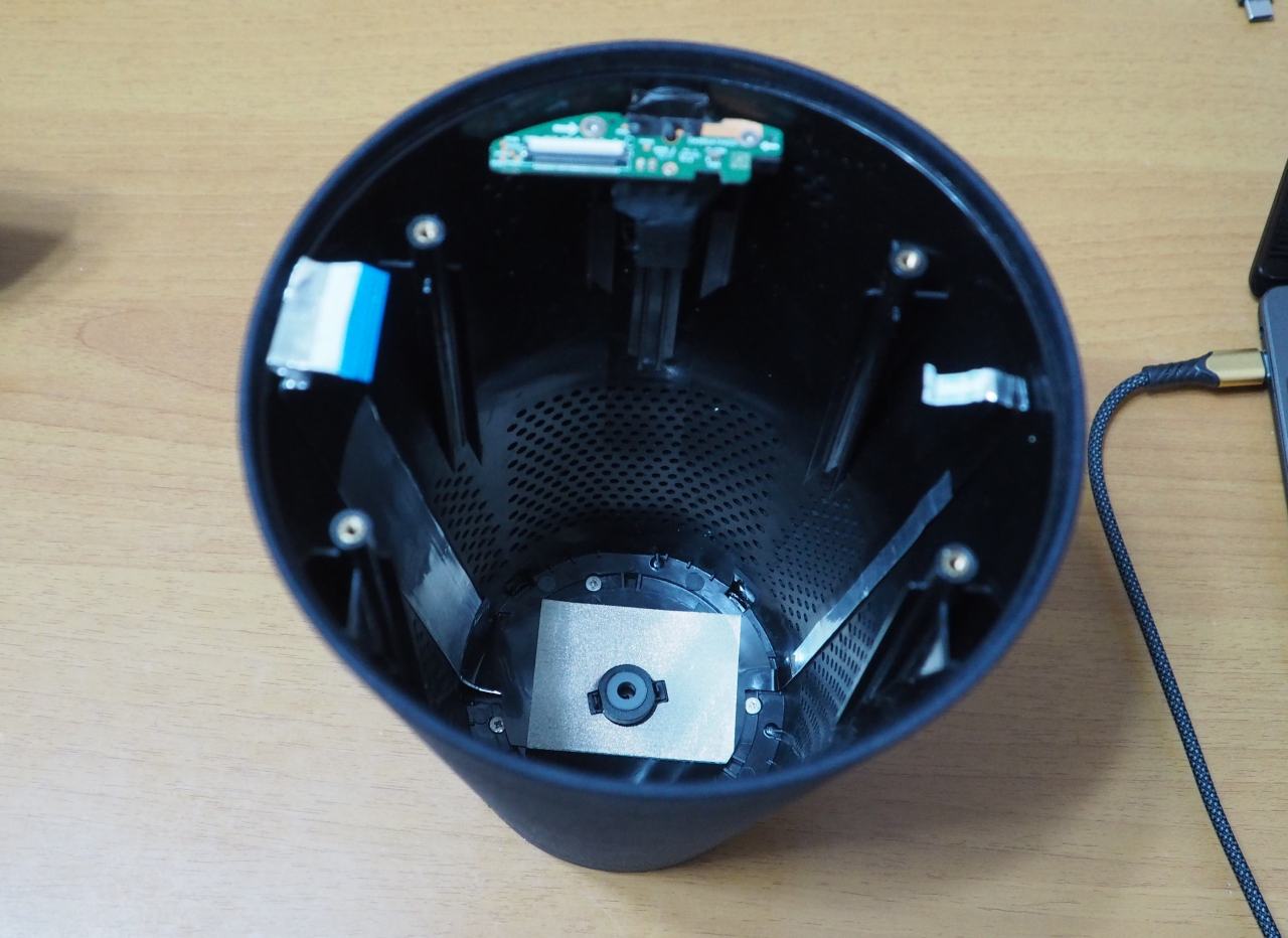モジュールを抜いた跡の筐体はこんな風になっています。Qiitaの記事写真では分かりづらかった内部構造がようやく判明。円錐の外周に無数のパンチ穴があいており、ドライバーからの音を周囲へ輻射できます。