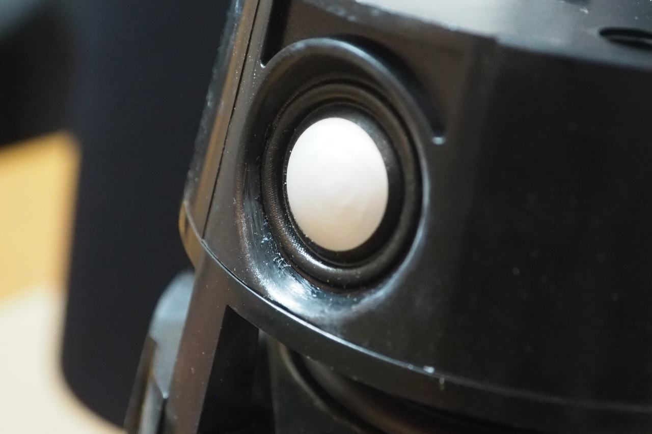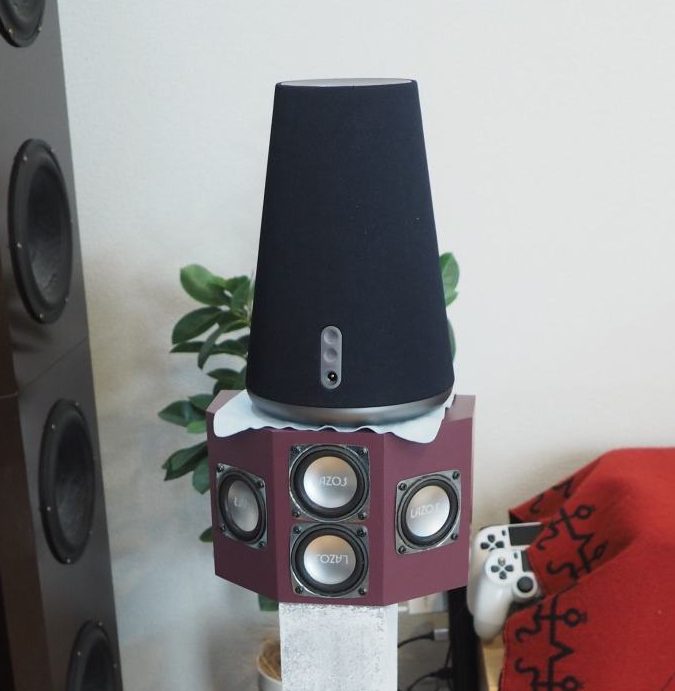 高域は対角の2本のドライバーで指向性を稼いでいますね。どっちへ向けて設置しても音が良いという配慮です。部屋の中央に置いて、部屋の誰に対しても音声浸透度が高いという見方もできるかもしれません。