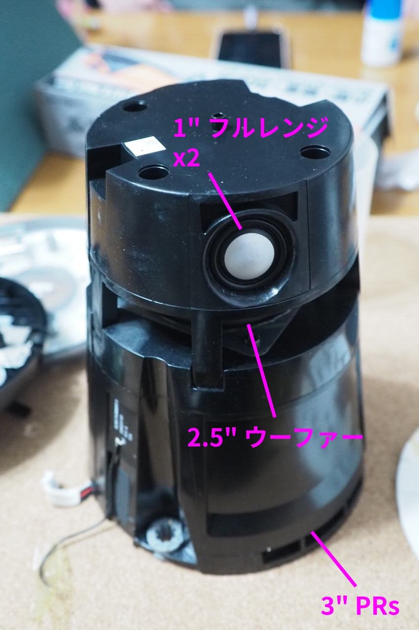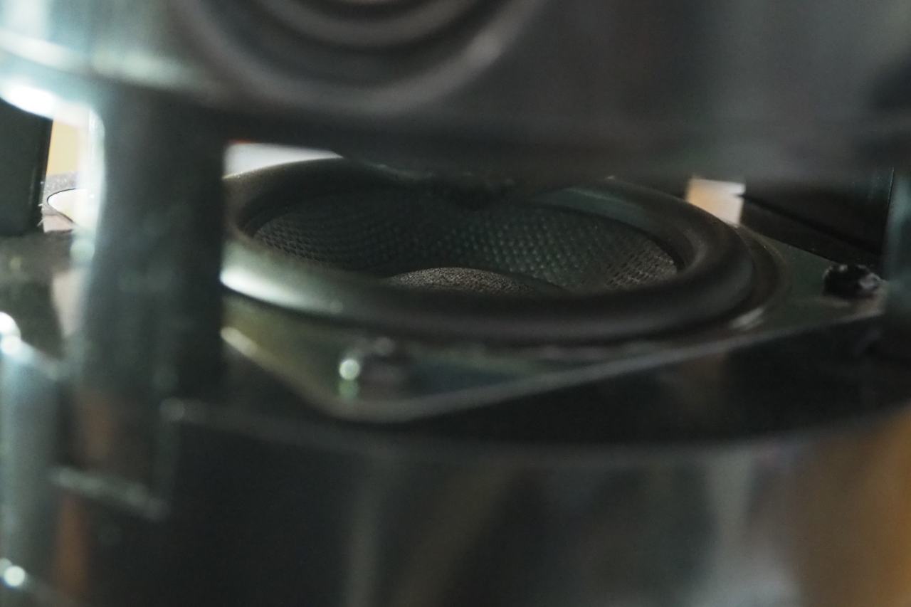 ちょっとサラウンドがヨレていますね。スピーカーに見えるかも知れませんが、これは自発的な発音はしないパッシヴラジエーターです。中部に付いているウーファーの背圧を受けて低音域だけを輻射します。