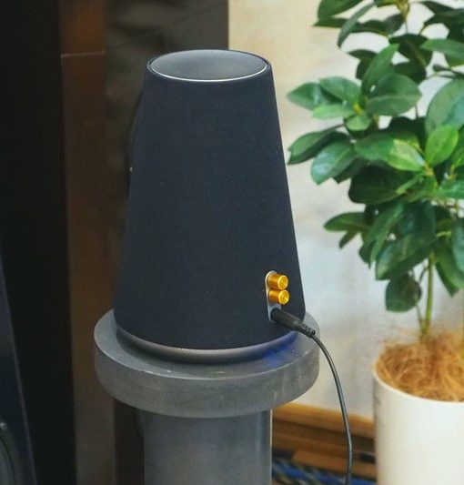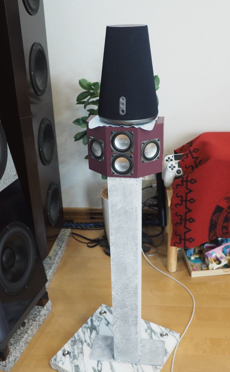 高域は対角の2本のドライバーで指向性を稼いでいますね。どっちへ向けて設置しても音が良いという配慮です。部屋の中央に置いて、部屋の誰に対しても音声浸透度が高いという見方もできるかもしれません。