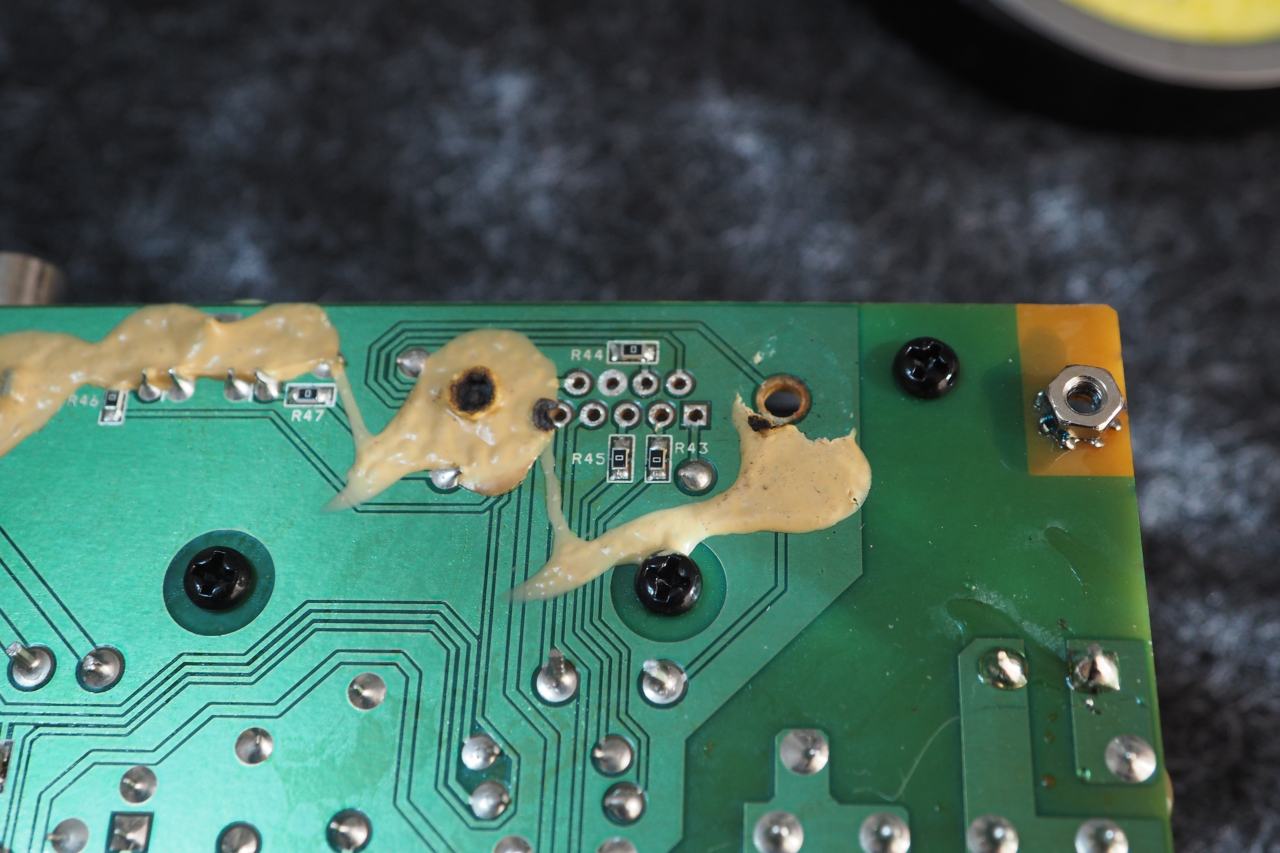 固定の為の接着剤を強引に溶かすべくハンダ吸い取り器を押し当てたので、焦げ焦げになってしまいましたね。