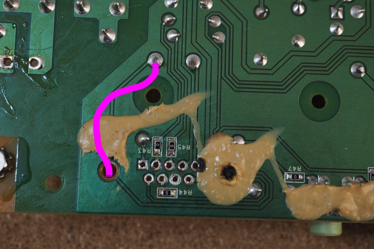 で、その白い線をどうするかですが。私はランドを先程引っ剥がしてしまったので、代りに白線を穴から通して図のランドへハンダ付けすれば大丈夫です。(そこからスターアースへ繋がっています)