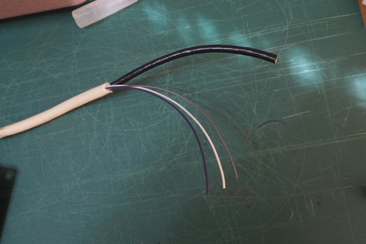 RS232Cリモコンケーブルを切って被覆を剥がしてみました。電源、信号GND、制御線、以外は黒くシールドされて送られています。配線が8/1ほどに短くなりますからね、ここまで厳重なシールドは要らなくなるでしょう。