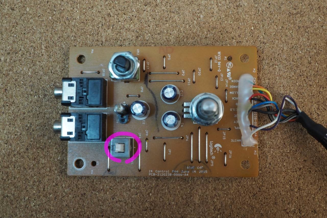 LogicoolのZ4って結構いい加減な作りで、完全には電源が切れないのです。完全OFFするにはパワーコードを抜かねばならない。例えば、このスイッチを切っても電源トランスは通電しっぱなしだし、パワーアンプも通電しっぱなし。プリ部への給電が絶たれるから、見かけ上電源が切れたように見えるだけというすごいスイッチです。(あんまりエコじゃない)