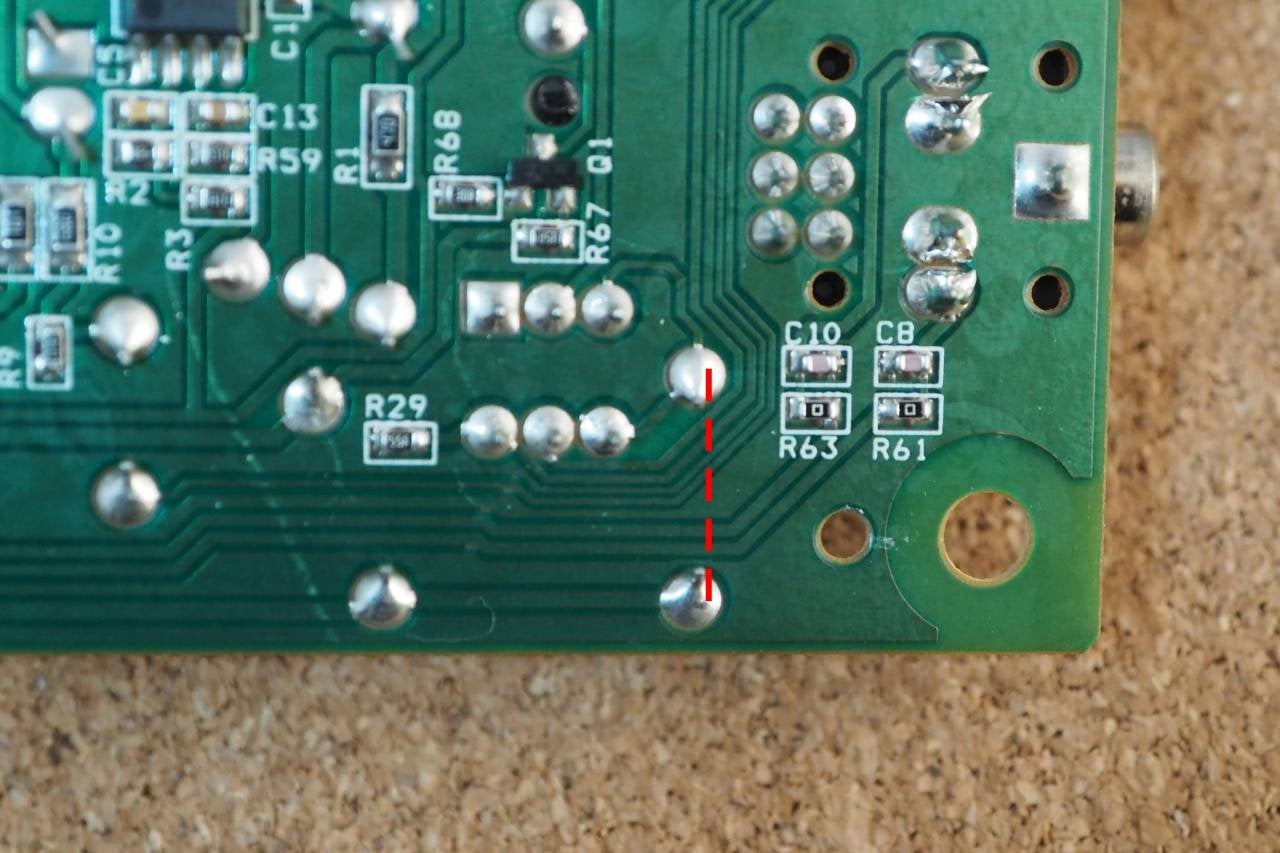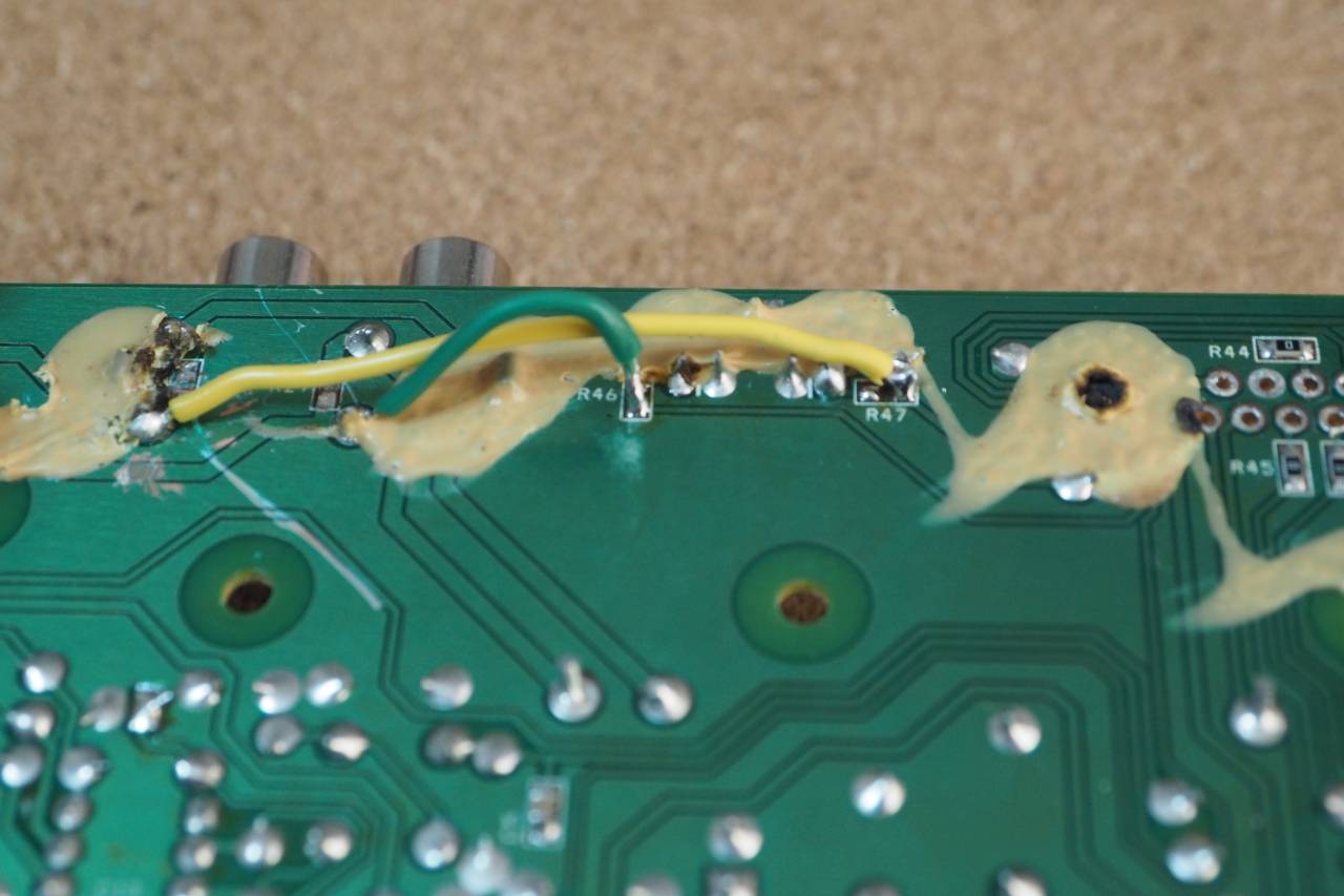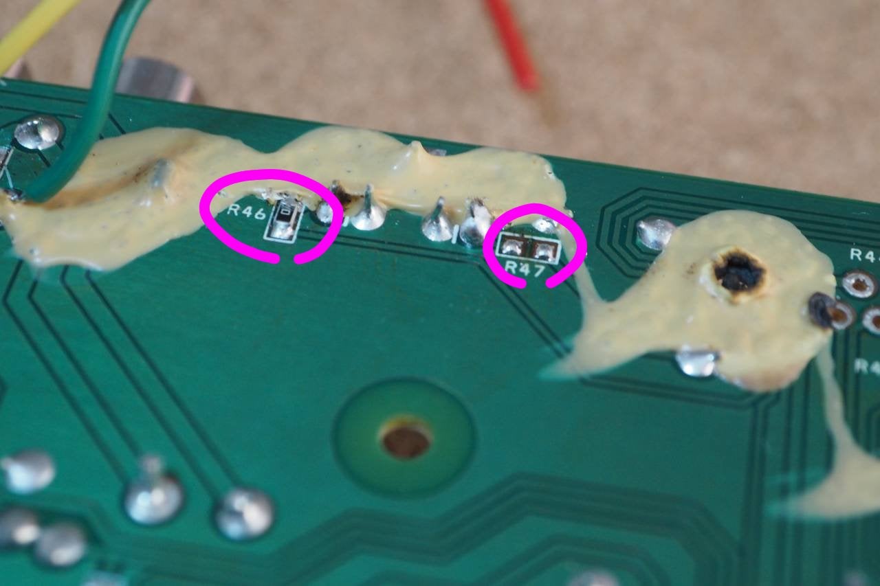 R46、R47はなんと、どちらも0Ωの抵抗値なのです。ダミーですね。このチップ抵抗を外してしまって、そのパッドに配線しようと考えました。チップ部品の外し方(付け方)なんて、知りませんよ。