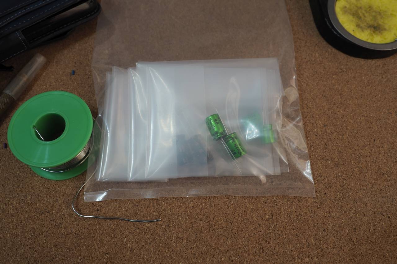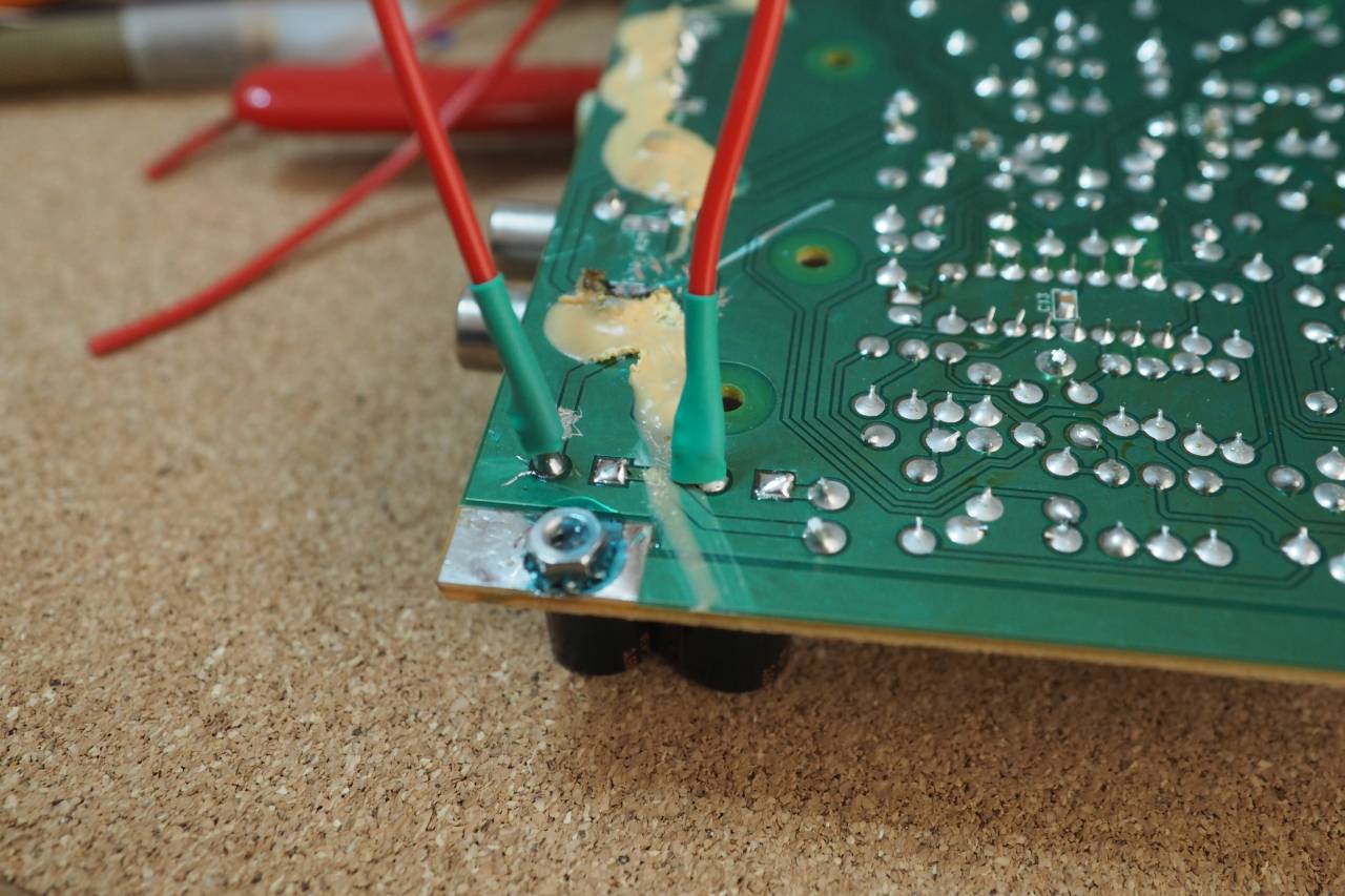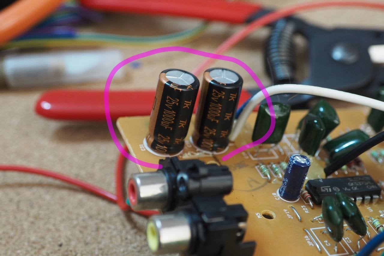 アンプ基板の出力キャパシタを換装します。質のよいものにしたいのと、脚を長くしたかったからです。この足を片方長めにして、そこへスピーカーケーブルを直付けします。