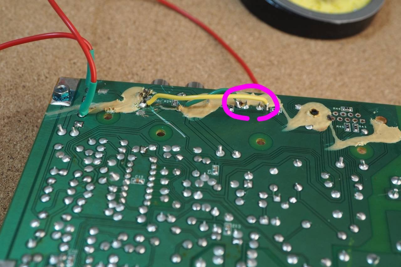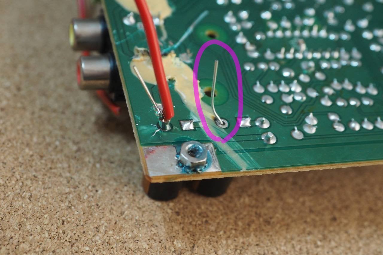 ついで、RCAジャックを入力端子に改造すべく、ミニジャックの入力ピンへ直接配線します。こうした改造はんだ付けをした後は、必ずテスターで他のランドを当たります。きちんと導通したか/他とショートせず絶縁できているか。