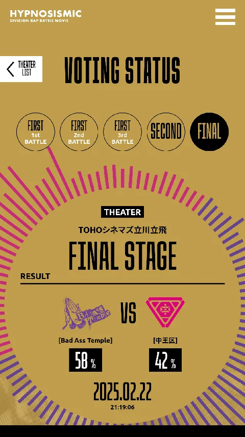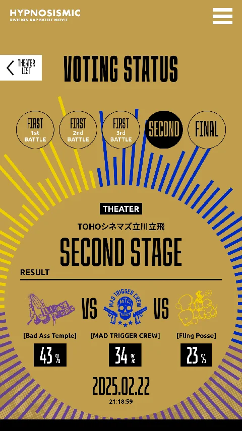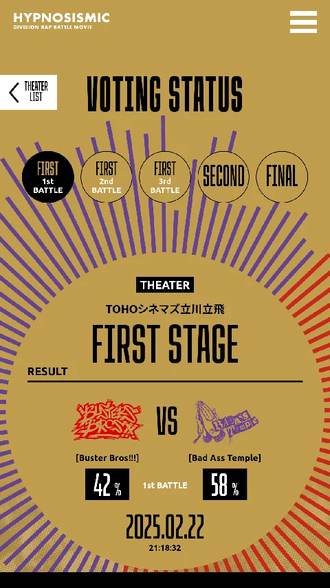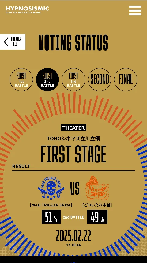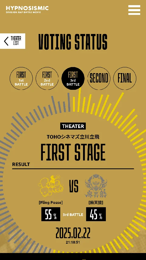 各勝負のリザルトは後ほど公式ホームページでも観られます。ただし、以下スクショはあくまでもTOHOシネマズ立飛の私の体験結果ね。これは上映館によって結果が全然違うわけですよ。全国のハコの結果を観ることができます。でも、「全国集計」はまだ見たくない!上映が終わってから公式からの発表を待ちたい。