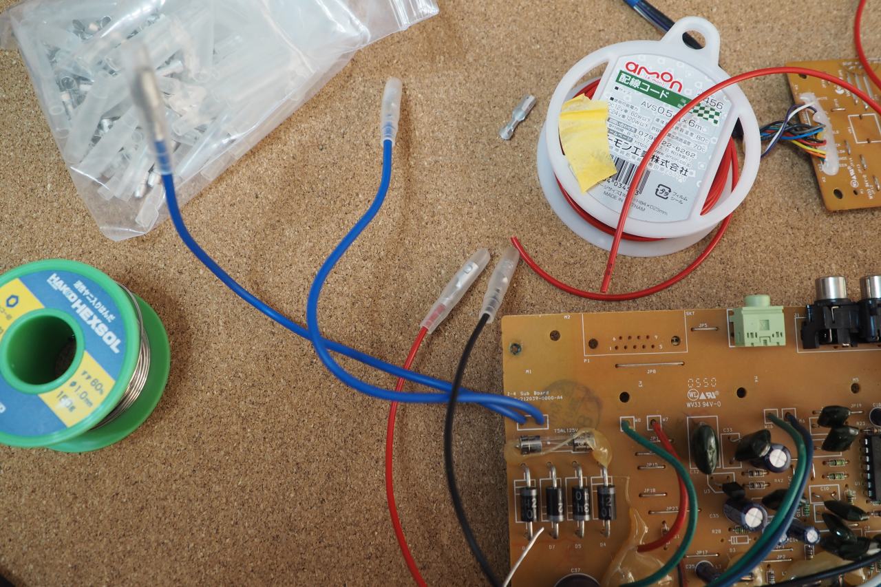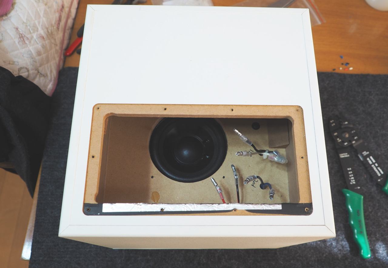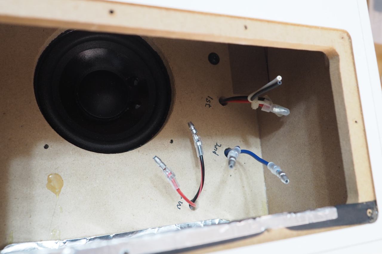 ウーファー箱側にオスのギボシを付けていく。けっこうこれが大変で。入口が狭いうえにケーブル長が凄く短いので、電工ペンチが上手く入っていきません。カンと手探りで慎重に作業しました。