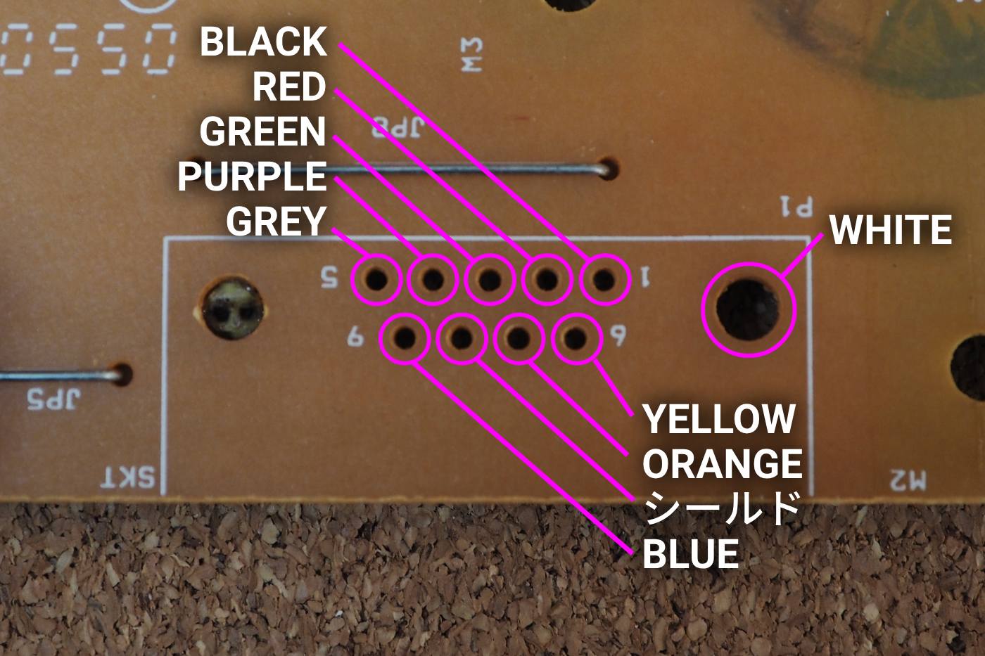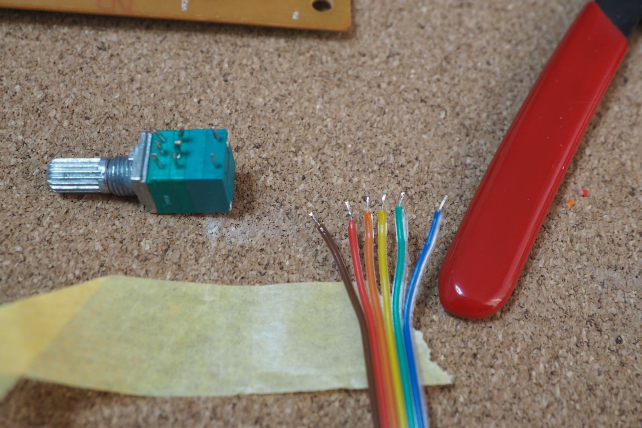 ボリュームの配線にはリボンケーブルを用いました。10線のケーブルを6本ぶんに裂いて配線します。