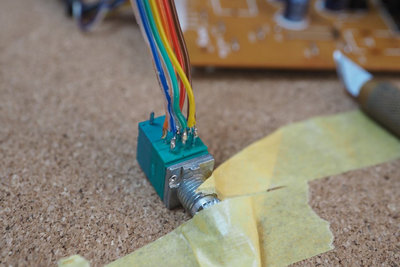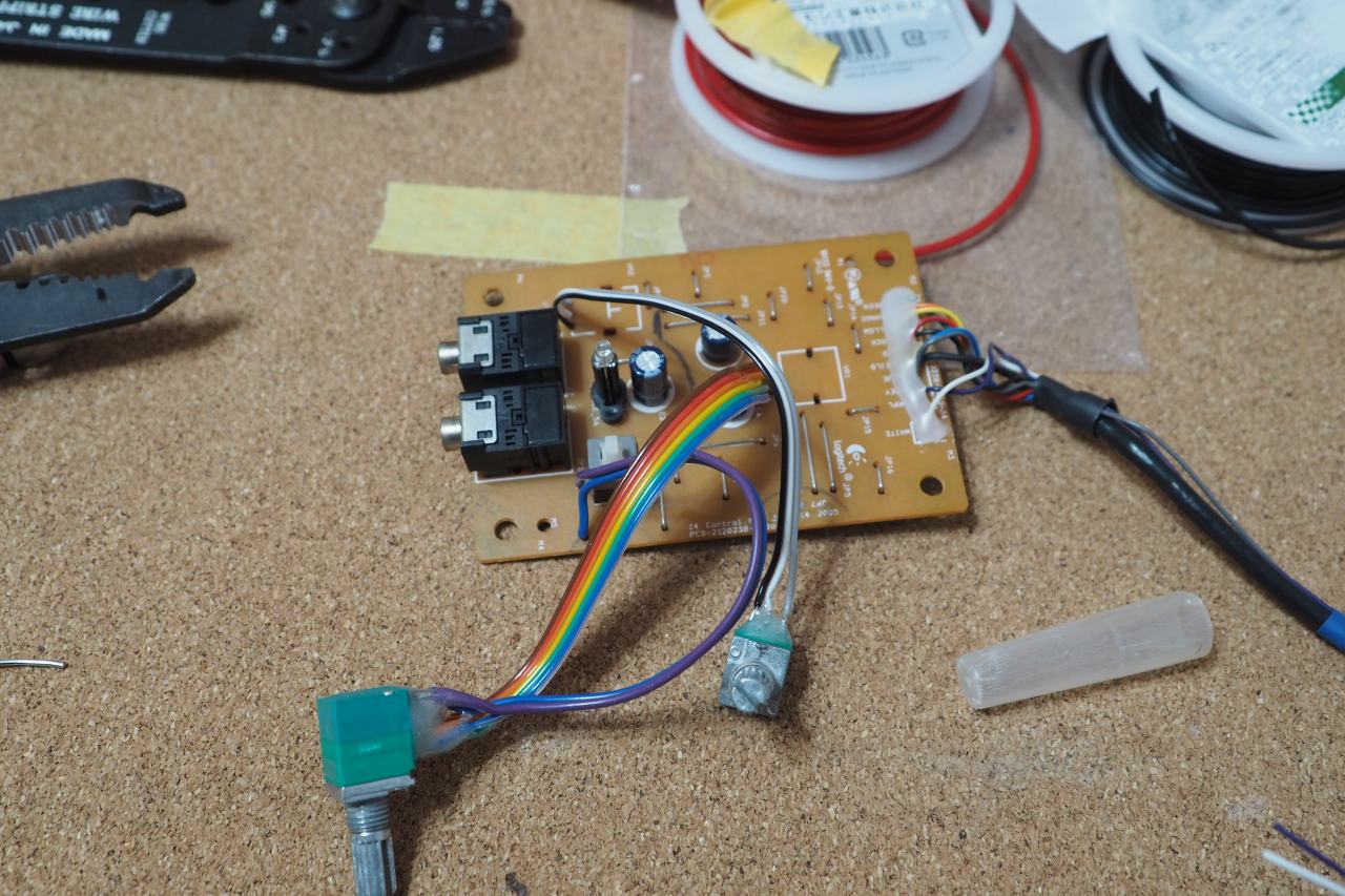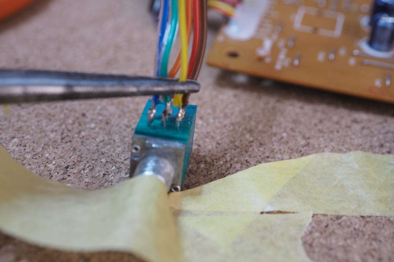 出来上がったらPCB側に配線をはんだ付けします。ボリューム配線はボリュームが小さくラインが多く、今回の工作ハイライトでしたが、問題なく結線ができました。