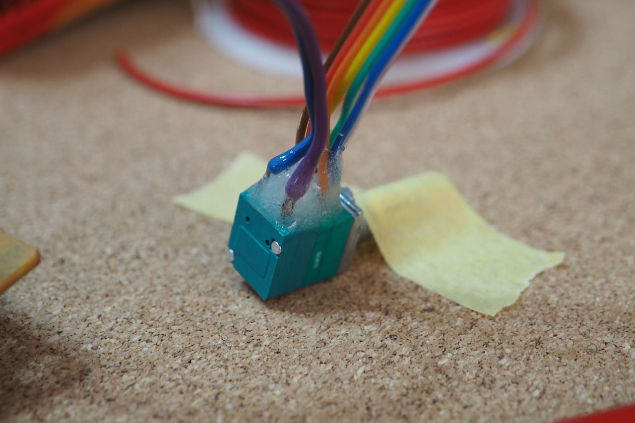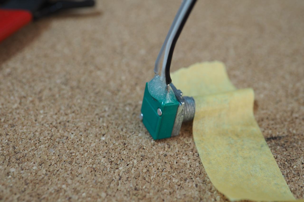 うまくはんだ付けが出来たら、ヒゲが出ているところをデザインナイフでこそげ落とし、絶縁を確保します。確実な接続と絶縁が確認できたら、エポキシでケーブルを補強します。ケーブルの接合部は脆弱ですからね、断線原因の宝庫です。こうしておくと、工作中の不用意なケーブル断線やショートを防げます。