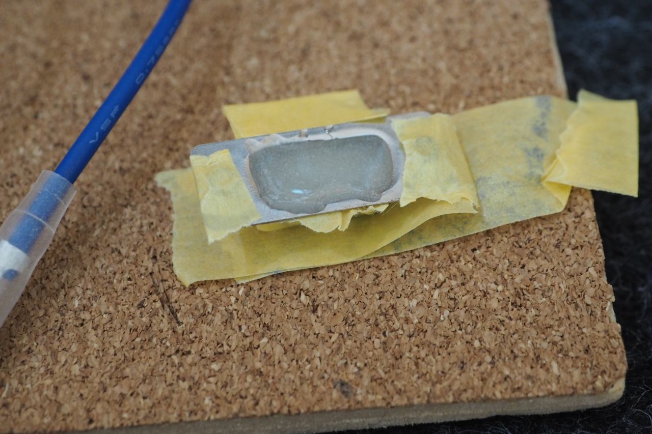 乾いてからテープ除去したところ。綺麗に平面で穴が塞がっています。これをそのままリアパネルへ取り付ければ穴塞ぎは成功です。これを密閉蓋として使います。