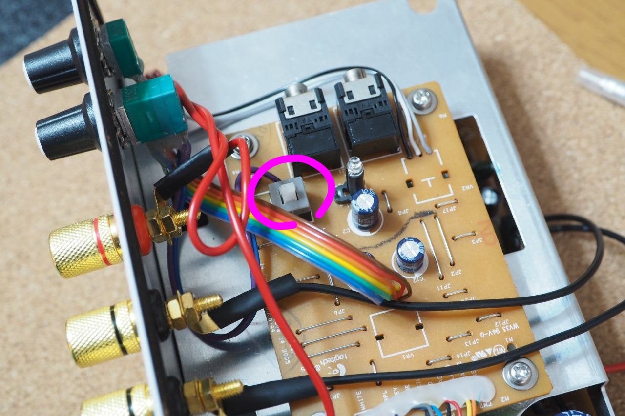 電源スイッチの2線も配線します。このボリュームスイッチには計8本のケーブルが集まっています。リボンケーブル以外では綺麗に配線はムリですね。